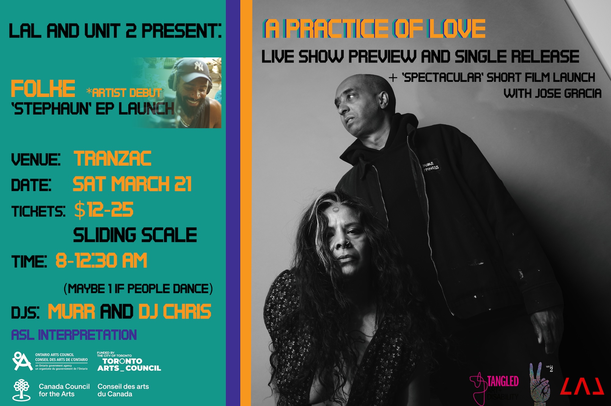 "LAL & Unit 2 Present: A Practice of Love: LAL new live show / album preview, Single Release, and SPECTACULAR FILM showing by LAL and Jose Garcia plus Folke EP launch of Stephaun Venue: Tranzac Date: Sat march 21 tickets: $12-25 sliding scale Details 8-12:30 am (maybe 1 if people dance) schedule: 8pm doors 8:45 Folke EP live performance 9pm: Spectacular Film showing 9:45: LAL 1 hour performance 10:45: dancing with Dj Chris and Murr (vinyl set) Sponsored by: Canada Council for the Arts, Toronto Arts Council, Ontario Arts Council, and Tangled Art + Disability"
