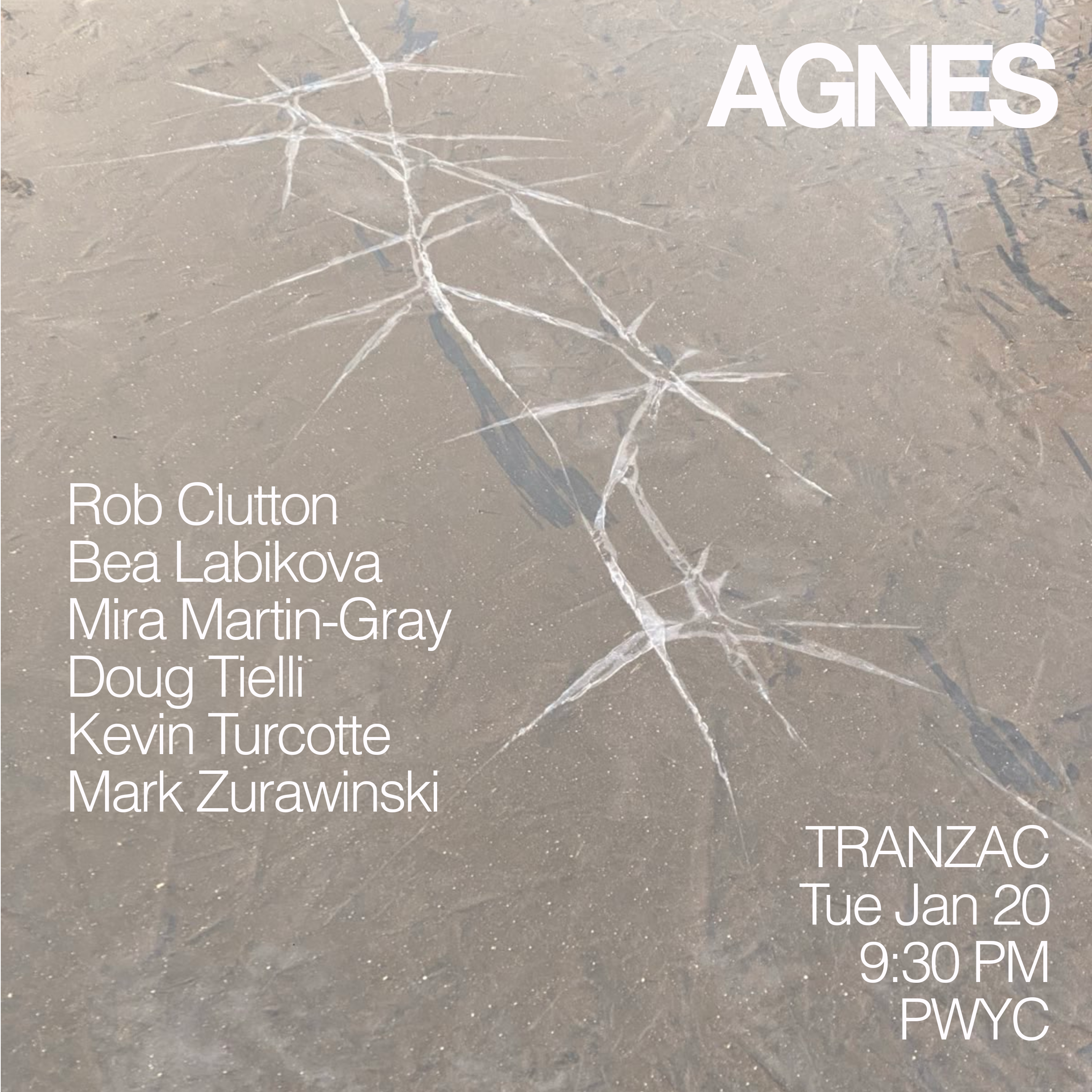 "Agnes is a new sextet of improviser-composers featuring Rob Clutton (double bass), Bea Labikova (reeds), Mira Martin-Gray (electronics, voice, noisemakers), Doug Tielli (trombone, guitar, voice, singing saw), Kevin Turcotte (trumpet), and Mark Zurawinski (drums). The group's distinctive instrumental palette flows between delicacy and power in equal measure. "