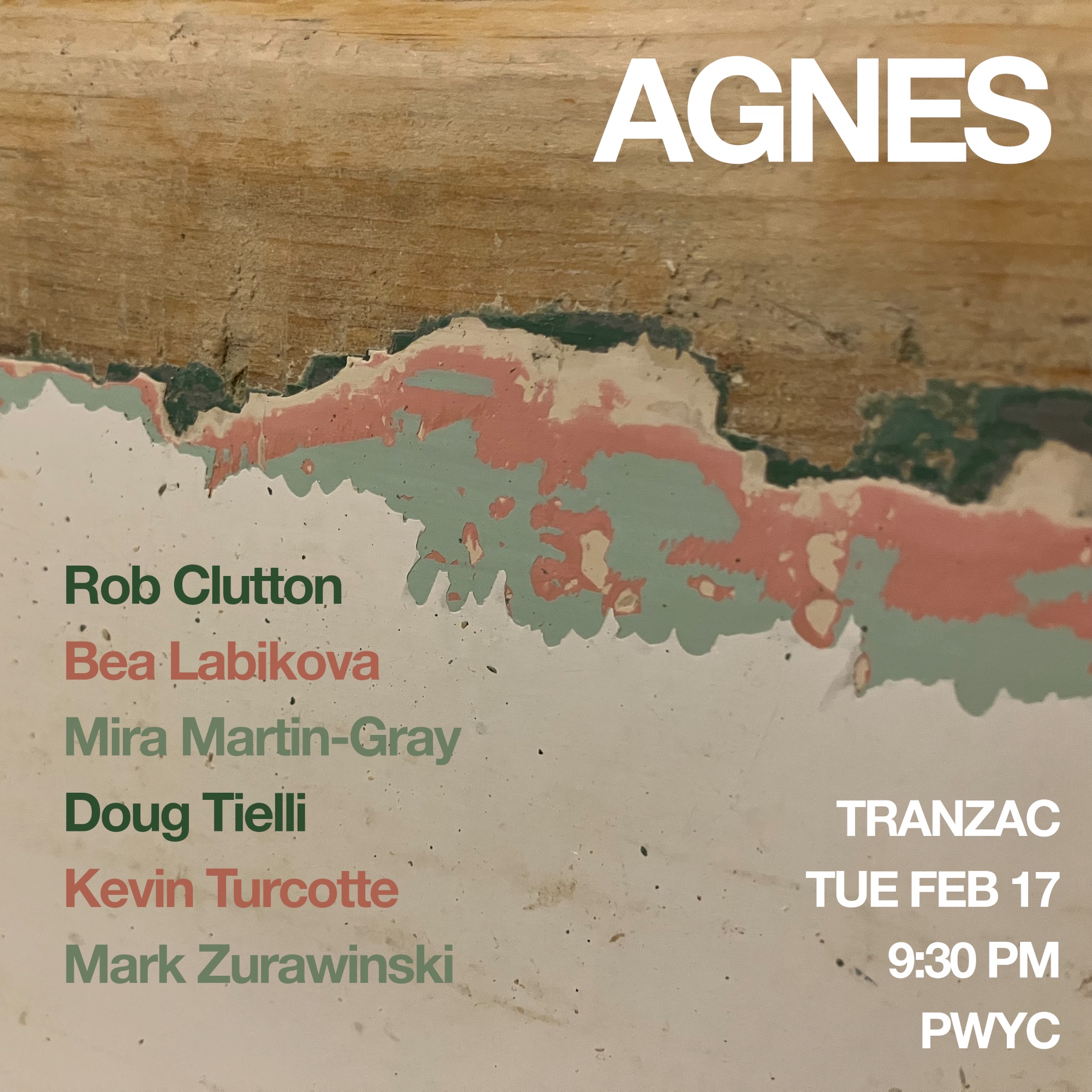 "Agnes is a new sextet of improviser-composers featuring Rob Clutton (double bass), Bea Labikova (reeds), Mira Martin-Gray (electronics, voice, noisemakers), Doug Tielli (trombone, guitar, voice, singing saw), Kevin Turcotte (trumpet), and Mark Zurawinski (drums). The group's distinctive instrumental palette flows between delicacy and power in equal measure. "