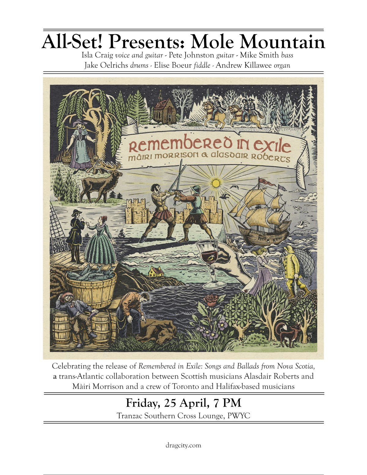 Come help us celebrate the release of Remembered in Exile: Songs and Ballads from Nova Scotia (Drag City), a trans-Atlantic collaboration between Scottish musicians Alasdair Roberts and Màiri Morrison and a crew of Toronto and Halifax-based musicians. Sadly our Scottish friends will not be present, but these humble Tranzac regulars we will do our best to render the songs as best we can in their absence. "