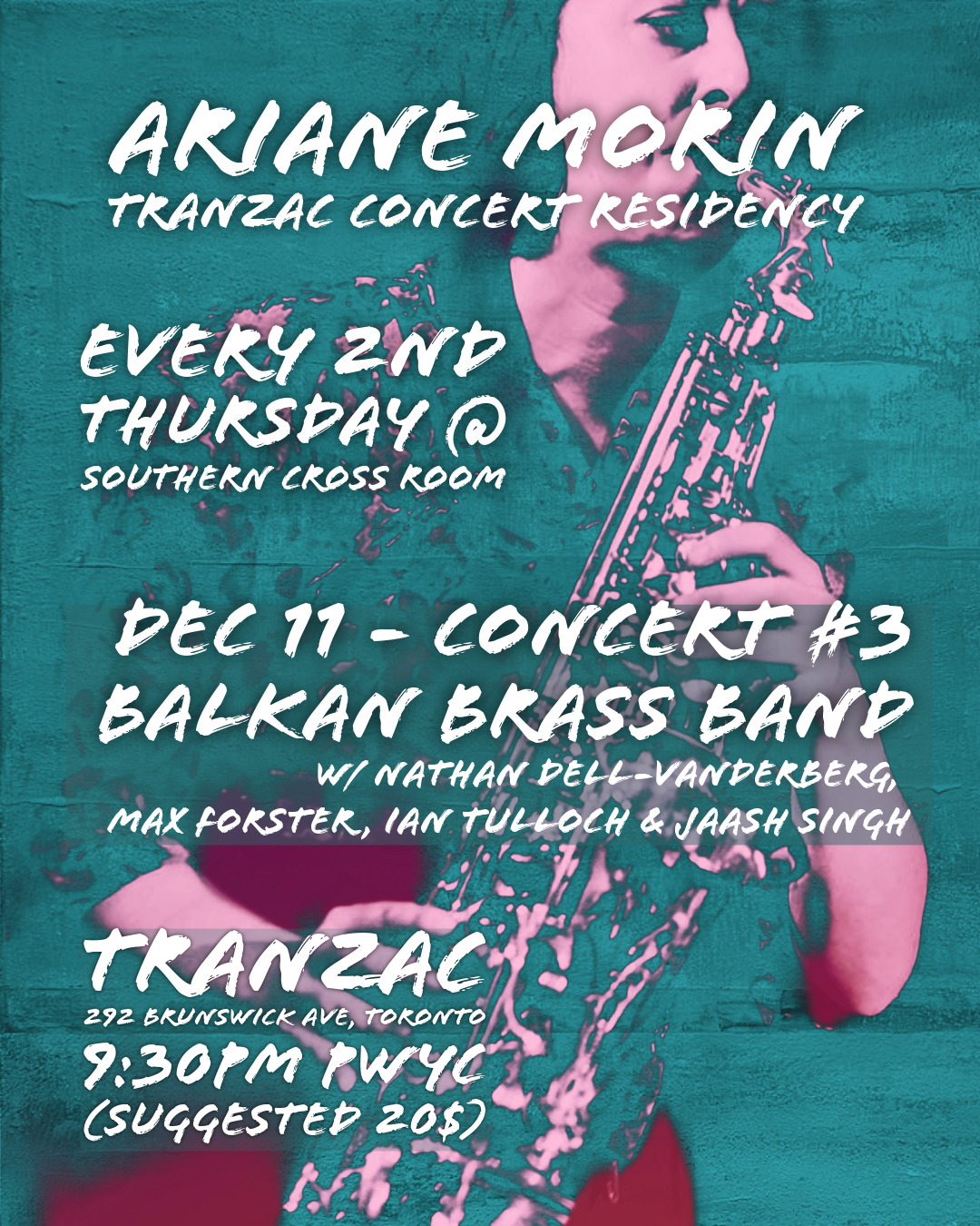 "Each 2nd Thursday of the month, Montrealer saxophonist Ariane Morin aims to create a space for new collaborations in Balkan, Greek, and Turkish music with musicians from the local Toronto diaspora scene. Each month features a different formation or focus—whether a dance-inspired Balkan brass night, an intimate café-aman style Greek set, and other possibilities—all showcasing the saxophone’s expressive capacity across varied contexts within Balkan and modal traditions.