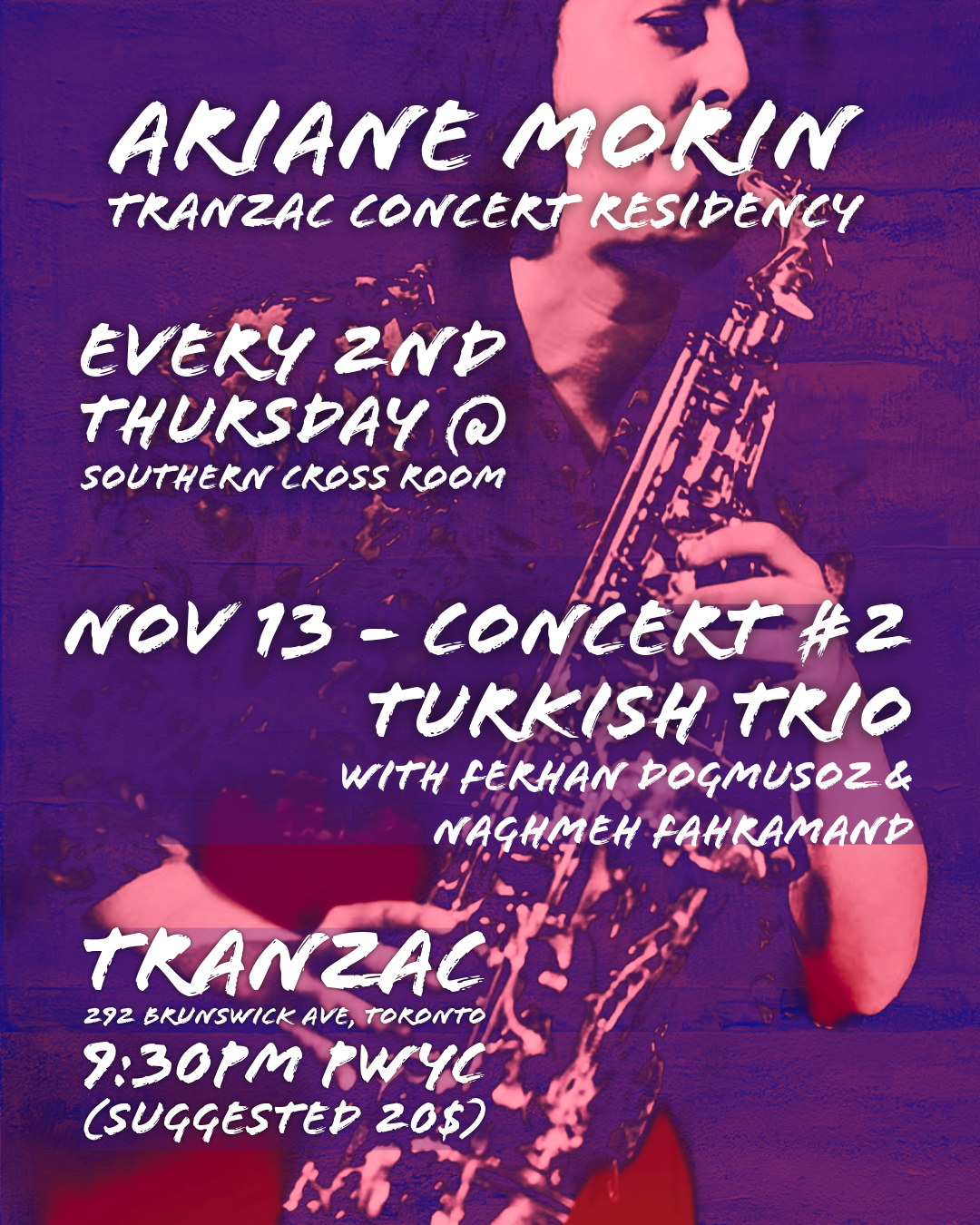 Each 2nd Thursday of the month, Montrealer saxophonist Ariane Morin aims to create a space for new collaborations in Balkan, Greek, and Turkish music with musicians from the local Toronto diaspora scene. Each month features a different formation or focus—whether a dance-inspired Balkan brass night, an intimate café-aman style Greek set, and other possibilities—all showcasing the saxophone’s expressive capacity across varied contexts within Balkan and modal traditions.