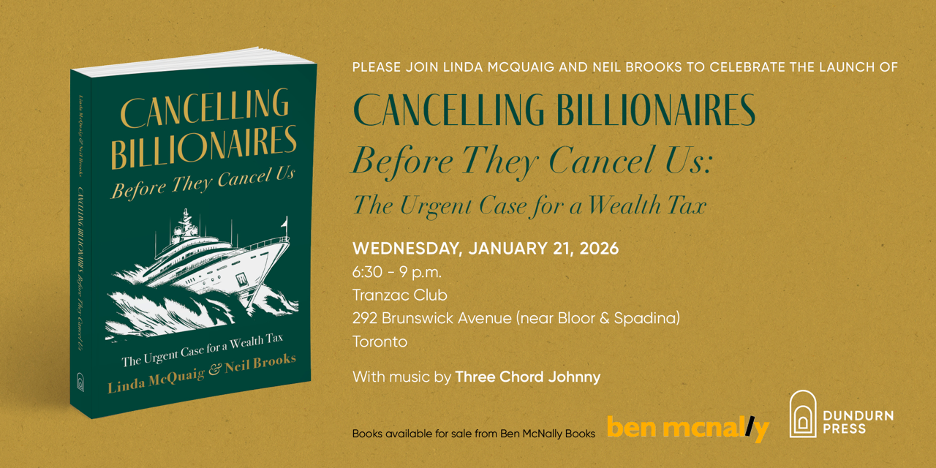 Linda McQuaig and Neil Brooks are delighted to invite you to the launch of their new book 'Cancelling Billionaires Before They Cancel Us -- The Urgent Case for a Wealth Tax.' Come and hear some inspiring words about how to clip the wings of billionaires, and then dance to the music of 'Three Chord Johnny.'