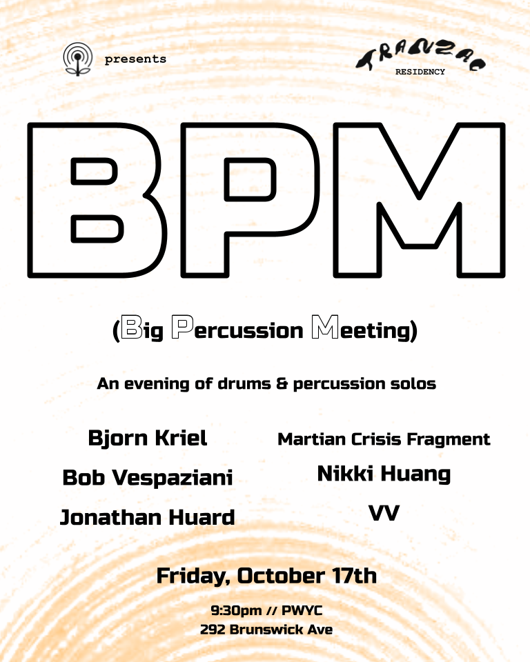 Welcome to the BPM (Big Percussion Meeting)! Every month we’ll be showcasing six percussionists across various experimental disciplines, each presenting a short solo set. We gather to exchange ideas, celebrate the breadth of the term “percussion”, and unfurl the fabrics of what makes each person a unique performer. Hosted by Colin Cudmore, your local rep for the Ministry of Phonic Services.