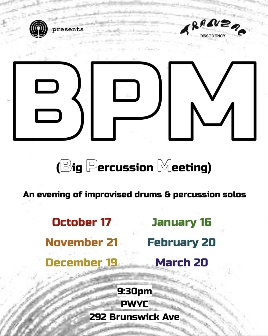 "The BPM (Big Percussion Meeting) returns! Join us in the Southern Cross for an evening of solo sets pushing the boundaries of the term ""percussion"", from six performers across various experimental disciplines.