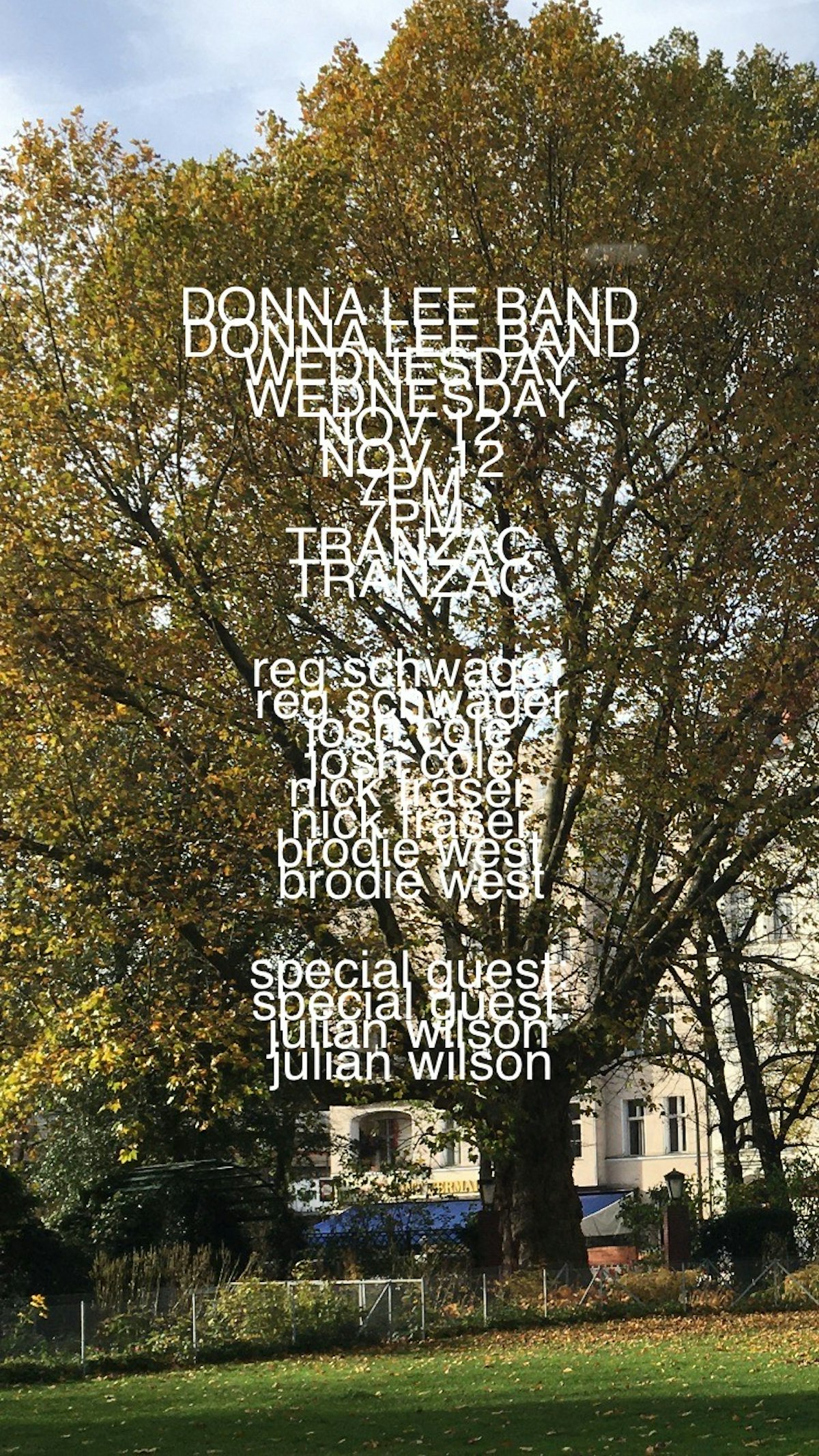Donna Lee Band featuring Reg Schwager on guitar, Josh Cole bass, Nick Fraser drums, Brodie West alto saxophone and special guest from Australia Julien Wilson tenor saxophone. The band plays extended adventurous, free bop? renditions of jazz classics. Mostly Donna Lee.