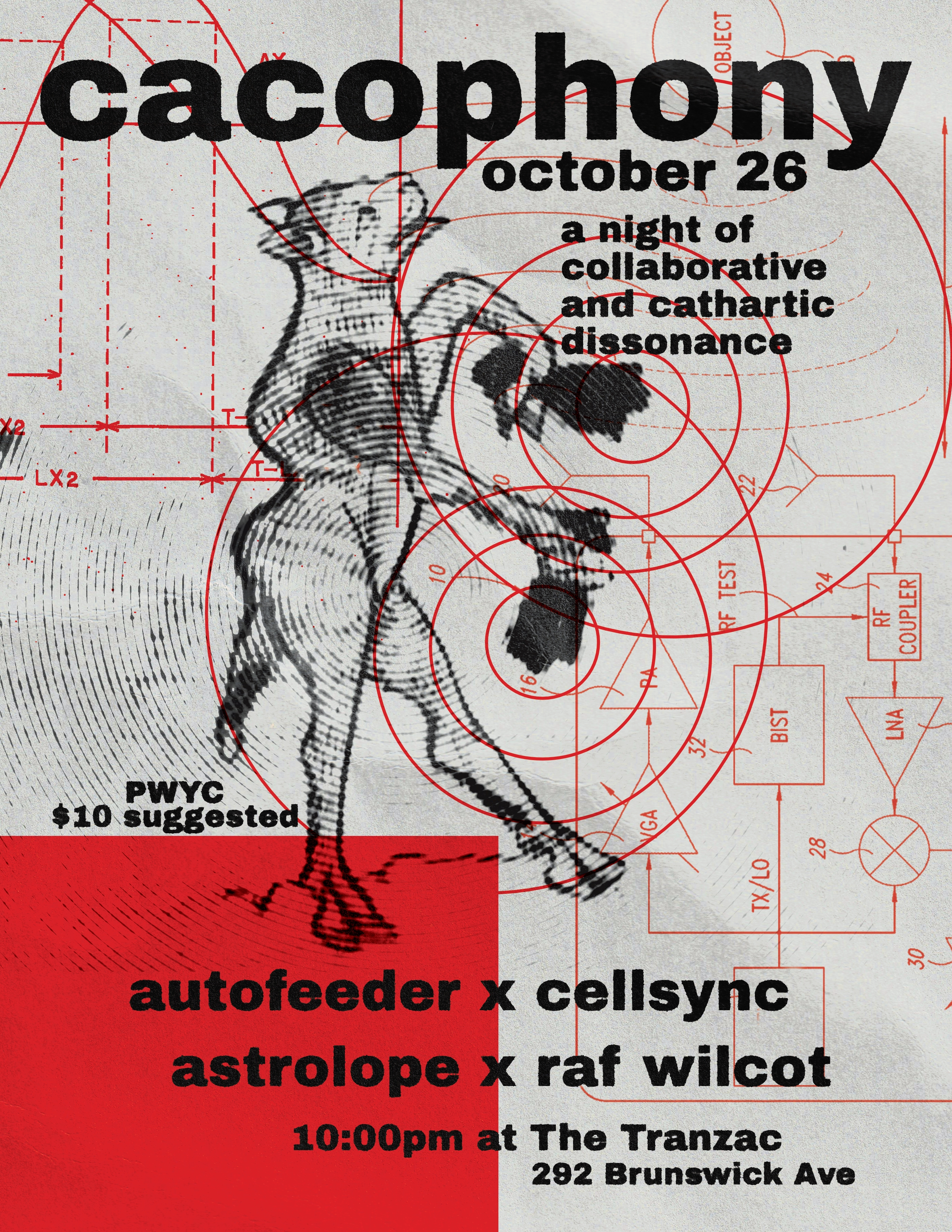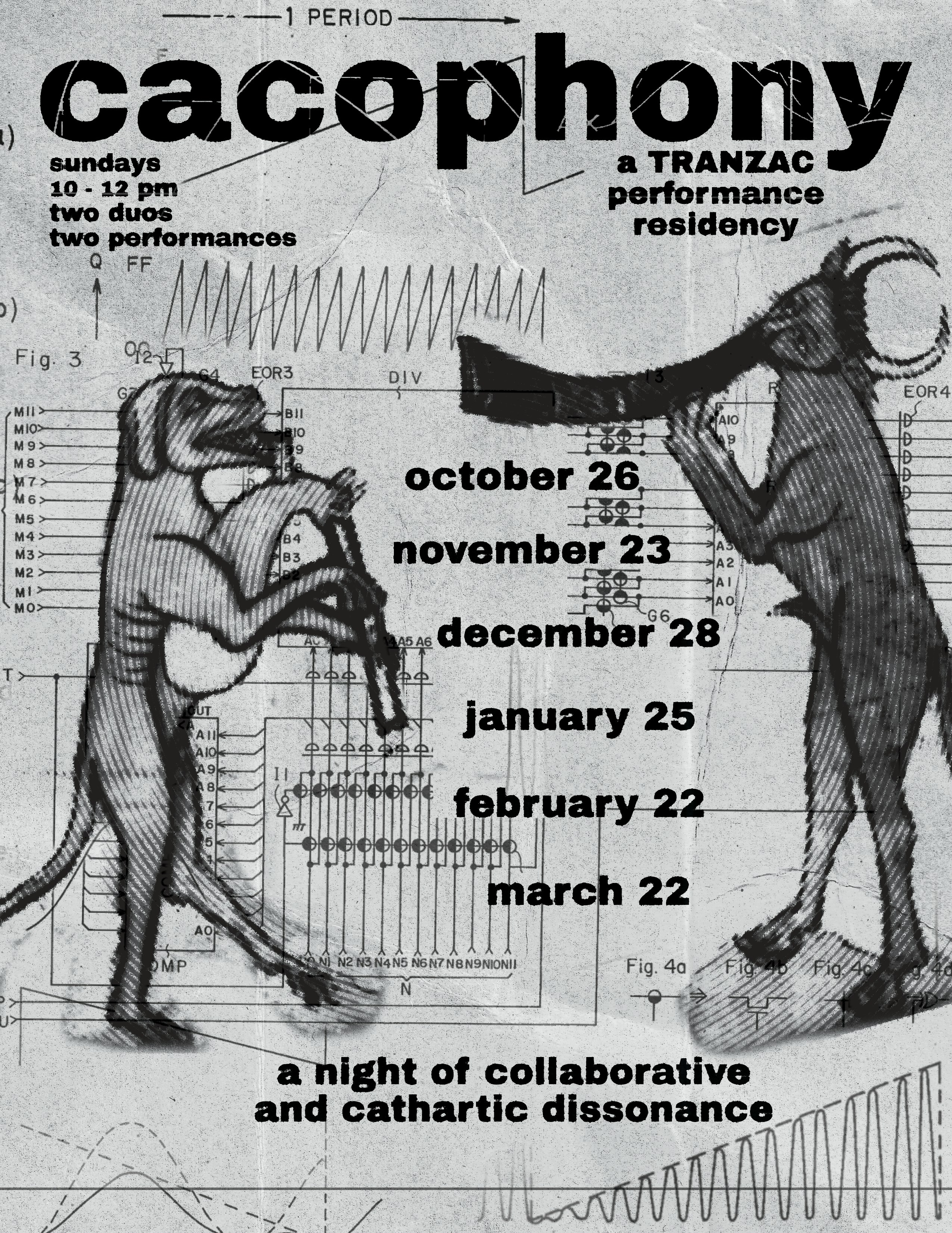 "Cacophony is a concert series focusing on new and improvised collaborations in electronic music, noise and sound art. Two new duos will be formed each night and the audience will have the rare chance to observe their very early stages of sonic collaboration. Cacophony is the sound of new ideas being formed on the spot. Whether melodic or atonal, it is informed by the unique perspectives of two artists seeking common ground. Through cacophony, connection on the fringe is made un-ignorable.