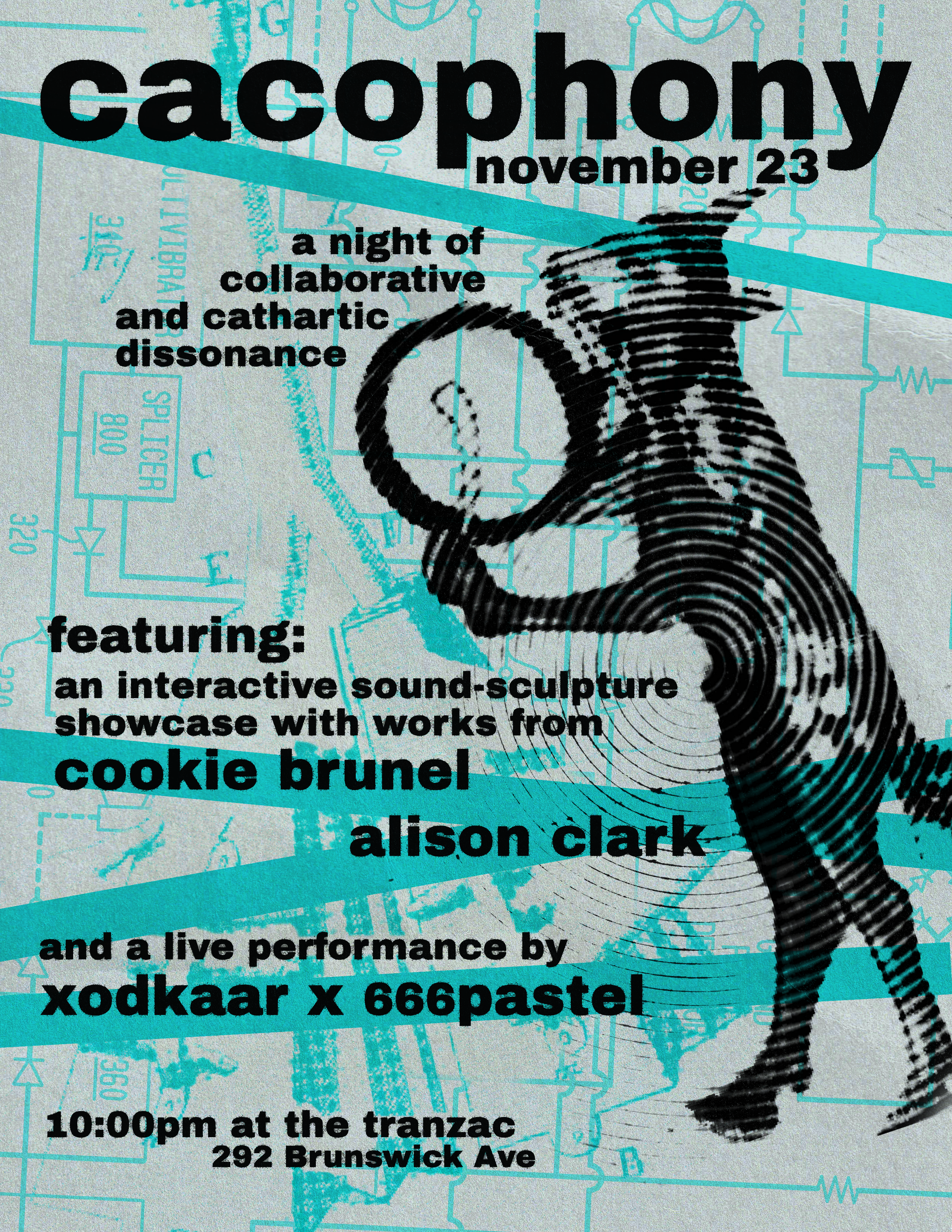 "Cacophony is a concert series focusing on new and improvised collaborations in electronic music, noise and sound art. Two new duos will be formed each night and the audience will have the rare chance to observe their very early stages of sonic collaboration. Cacophony is the sound of new ideas being formed on the spot. Whether melodic or atonal, it is informed by the unique perspectives of two artists seeking common ground. Through cacophony, connection on the fringe is made un-ignorable.