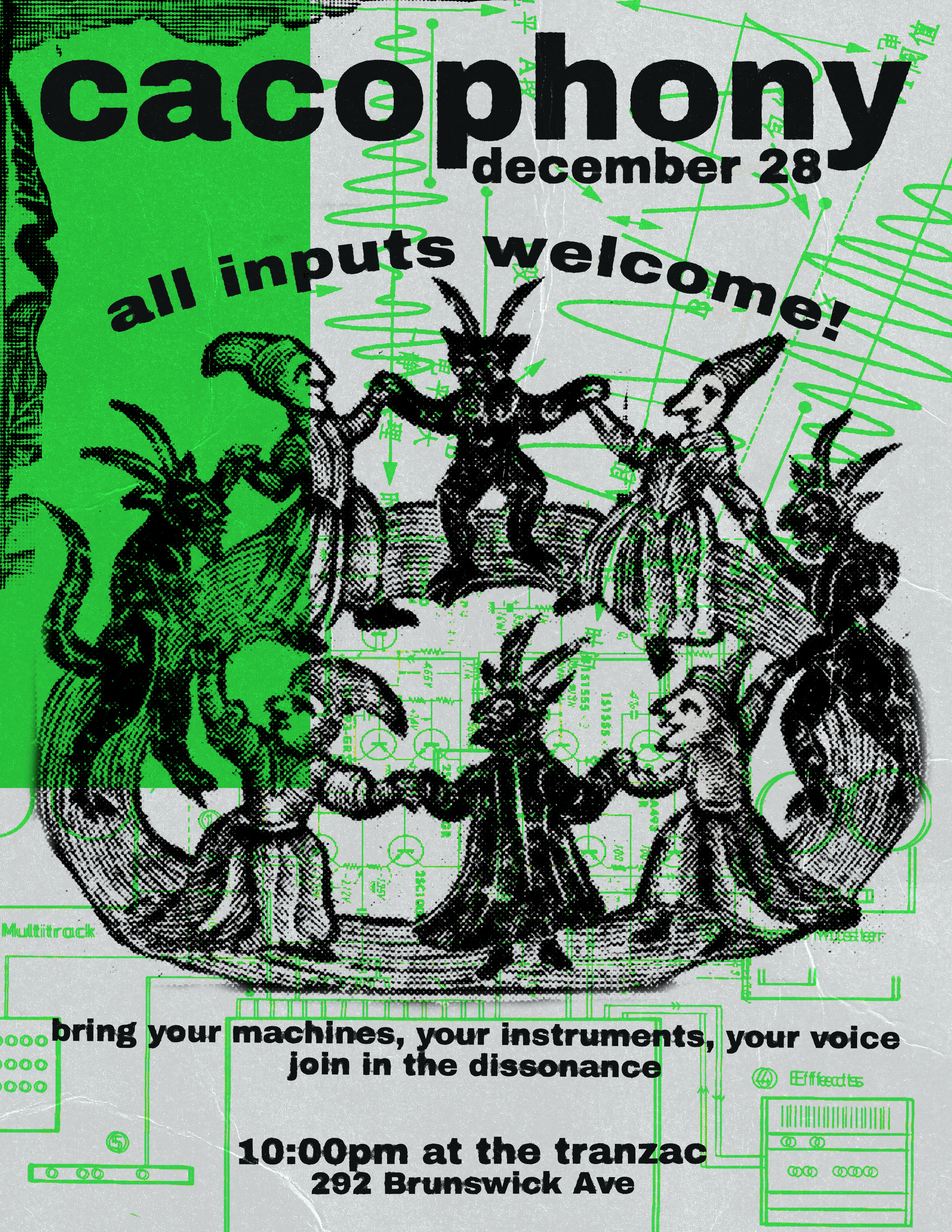 "Cacophony is a concert series focusing on new and improvised collaborations in electronic music, noise and sound art. Two new duos will be formed each night and the audience will have the rare chance to observe their very early stages of sonic collaboration. Cacophony is the sound of new ideas being formed on the spot. Whether melodic or atonal, it is informed by the unique perspectives of two artists seeking common ground. Through cacophony, connection on the fringe is made un-ignorable.