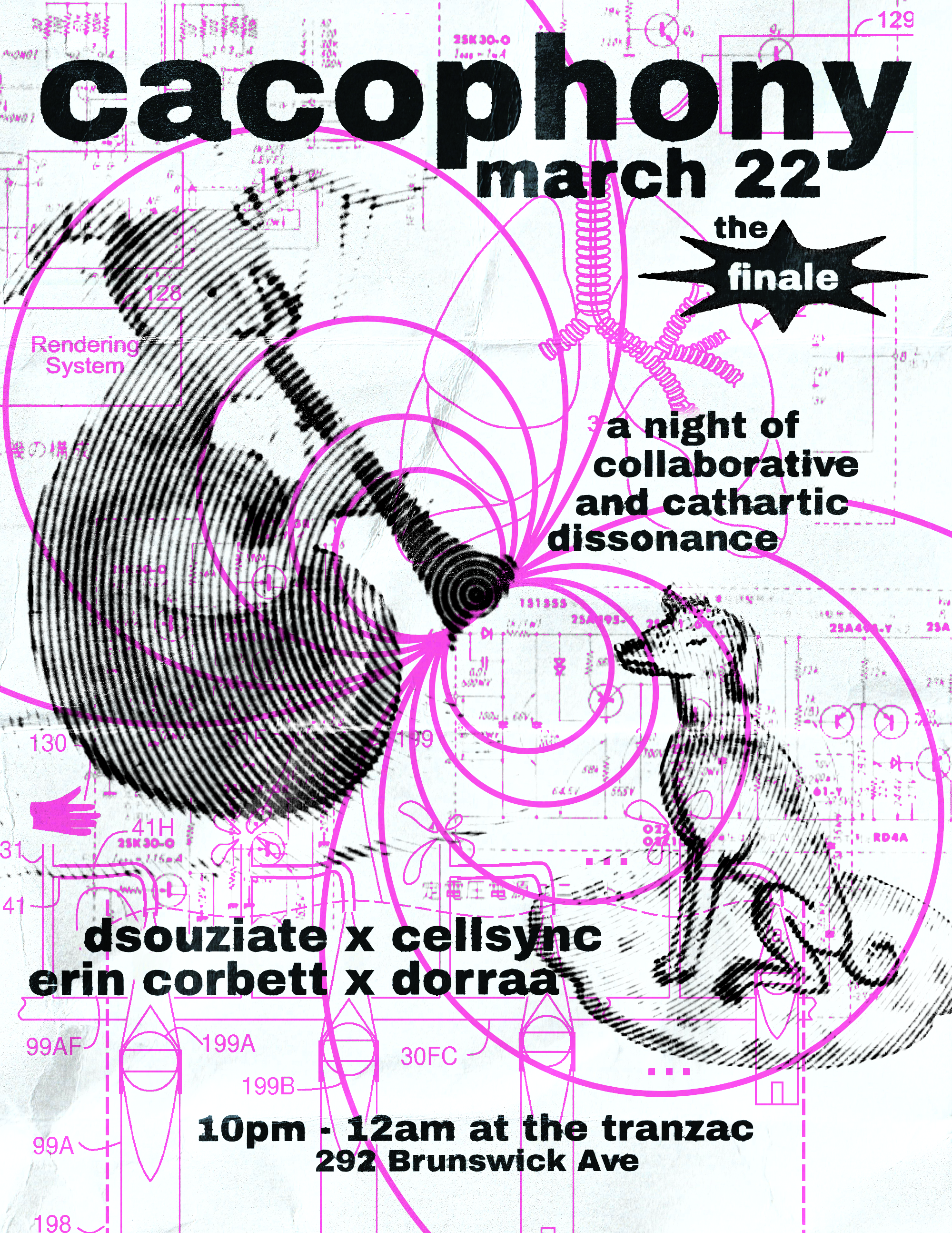 Cacophony is a concert series focusing on new and improvised collaborations in electronic music, noise and sound art. Two new duos will be formed each night and the audience will have the rare chance to observe their very early stages of sonic collaboration. Cacophony is the sound of new ideas being formed on the spot. Whether melodic or atonal, it is informed by the unique perspectives of two artists seeking common ground. Through cacophony, connection on the fringe is made un-ignorable."