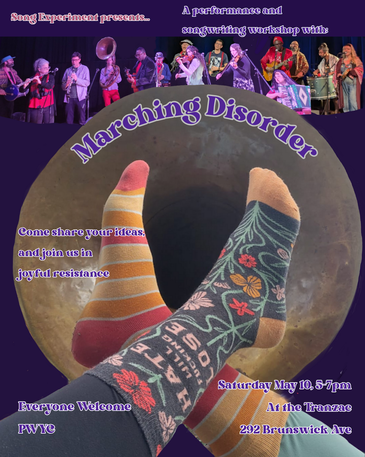 The first hour will feature a performance and the second hour will feature a songwriting workshop led by Marching Disorder.