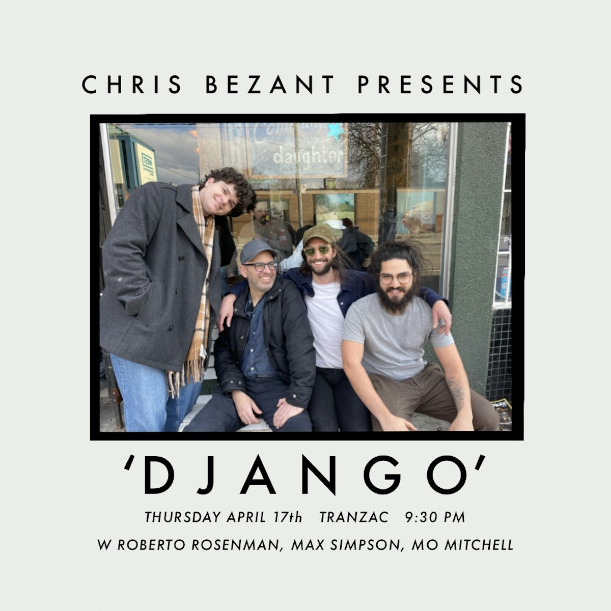 ‘Chris Bezant Presents Django' brings together a selection of Toronto's heavyweights to celebrate and explore the impression that Django Reinhardt continues to leave on music today. Join Chris Bezant, Jonathan Meyer, Roberto Rosenman, and Mo Mitchell, as they peer through one of the countless facets of the jewel that is Django's legacy. Come find warmth in the soft, channeled light ... come find ... "DJANGO"...