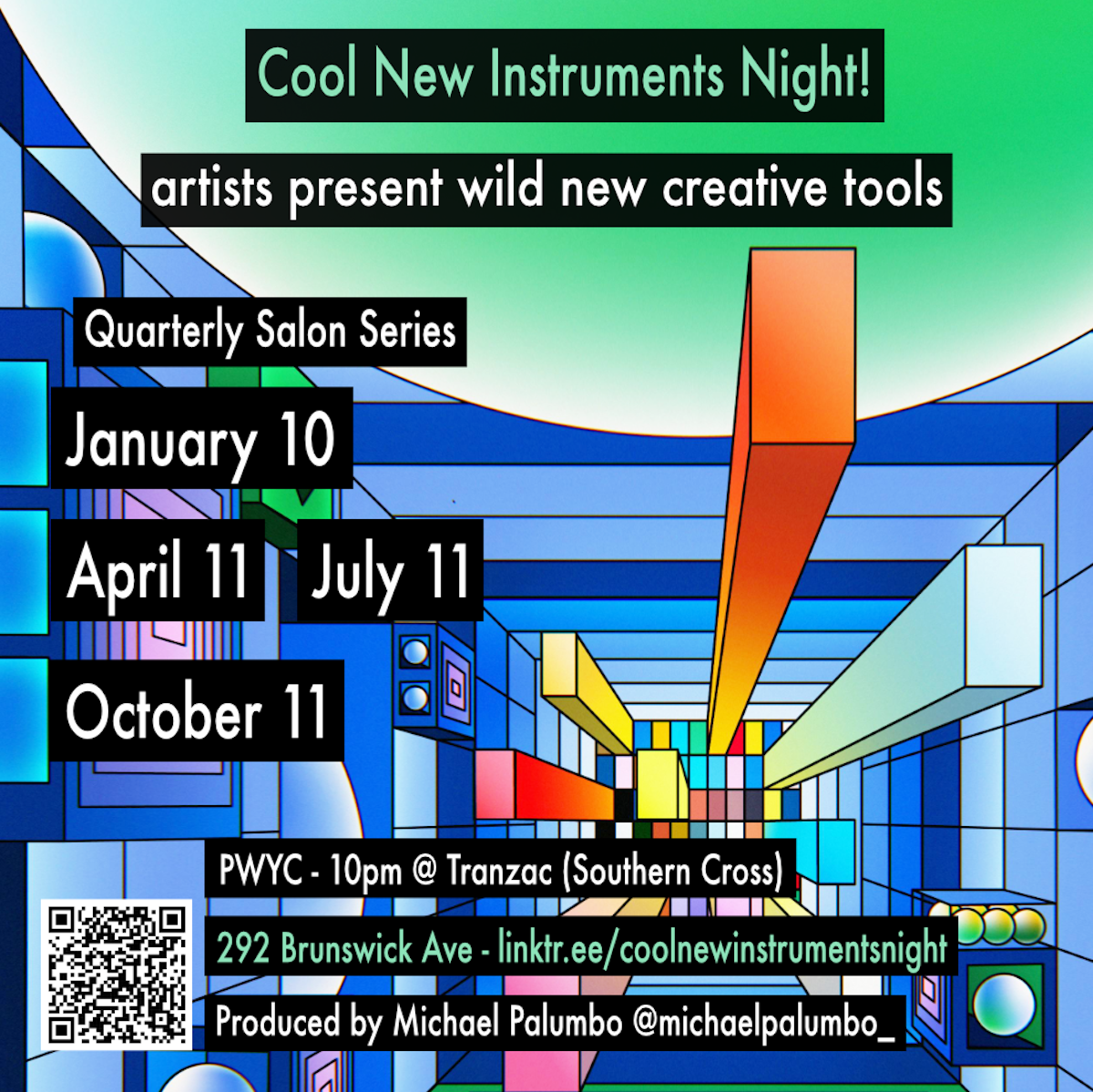 Artists present wild new creative tools—custom-built instruments, performance art, and performance devices that challenge conventional approaches to artmaking. Expect demos, short performances, and glimpses into the future of creation. A quarterly salon series produced by Michael Palumbo of Exit Points.