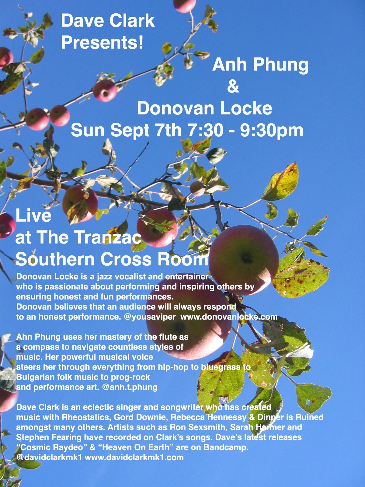Dave Clark Presents! Master musicians Anh Phung & Donovan Locke in an evening of thought provoking solo sets. Flautist Ahn Phung brings all of her heavy skills to bear with an array of sound toys to manipulate her music with, while Donovan will be bringing his prodigious vocal and leadership chops with his songbook of singalong sea shanties for all to join in on. Host Dave Clark will launch into his world of eclectic songs and stories for all.