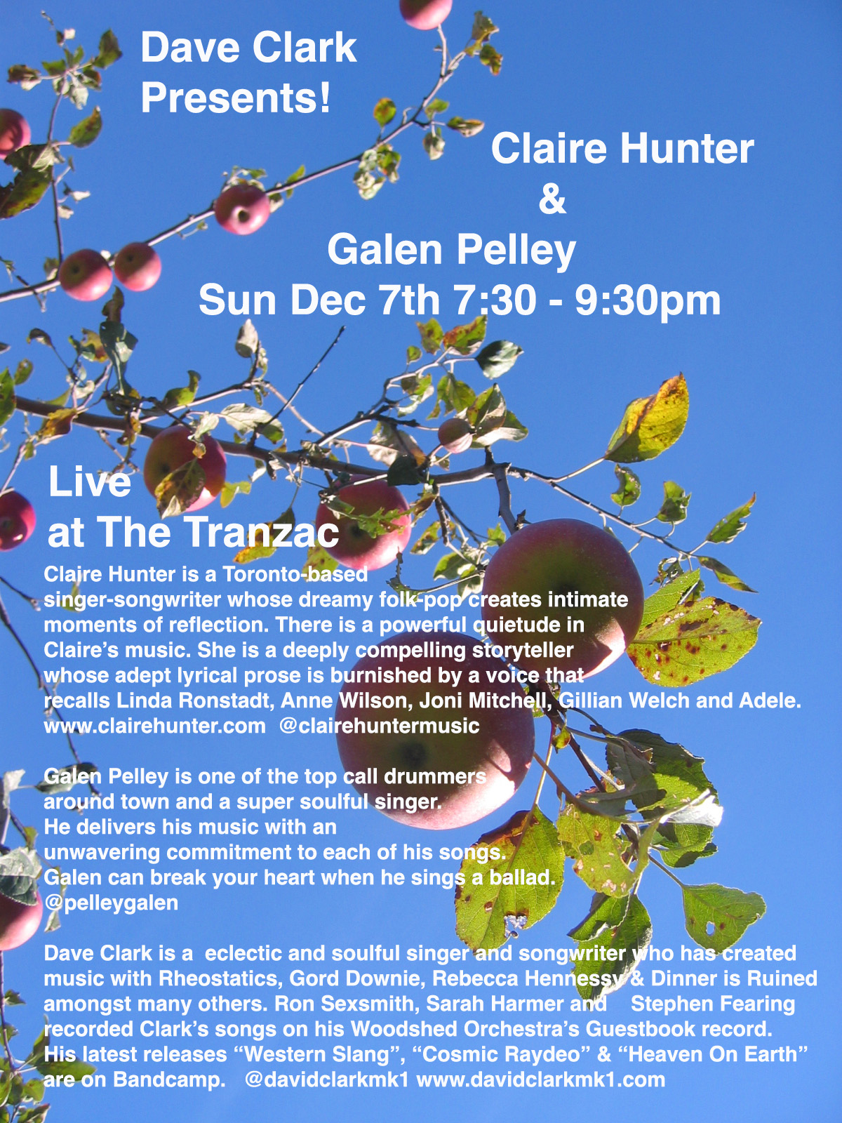 Dave Clark Presents! Singer-songwriters Claire Hunter & Galen Pelley. The evening will feature Claire, Galen & Dave performing a solo set each of their tunes. The music will range from soul, to blue grass, pop, folk, and jazz and more!