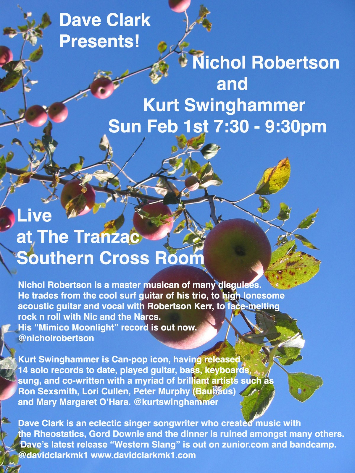 Dave Clark Presents! an evening with the great Nichol Robertson and the magnificent Kurt Swinghammer. Two local legends who can burn up the fretboard and deliver a tune in fine form indeed. Kurt, Nichol & Dave will perform a solo set each of their faves.