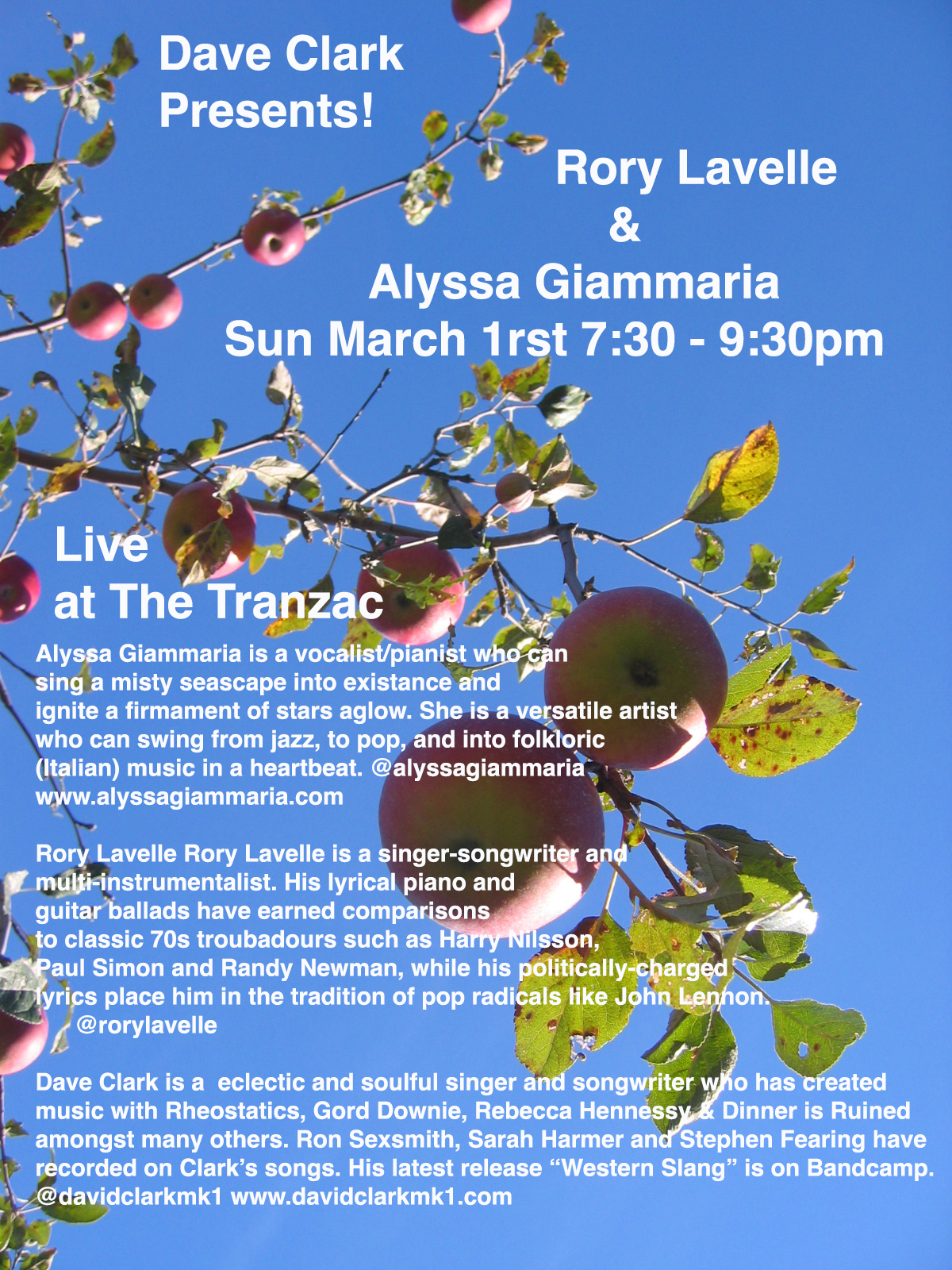 Dave Clark Presents! Rory Lavelle & Alyssa Giammaria. Rory is a piano and guitar slinging troubadour in the tradition of cats Like Randy Newman and Harry Nilsson. He writes politically charged lyrics a la John Lennon and is swift with a whitty phrase indeed. Alyssa is a singer songwriter who works from smoldering torch ballads, to pop gems and folkloric music. There's a touch of "Babs" in some of her delivery. Dave is an eclectic and soulful singer songwriter who delivers the news from down home splendour to what the fuck is up? wonder. 3 solo sets by three dedicated artists coming your way.