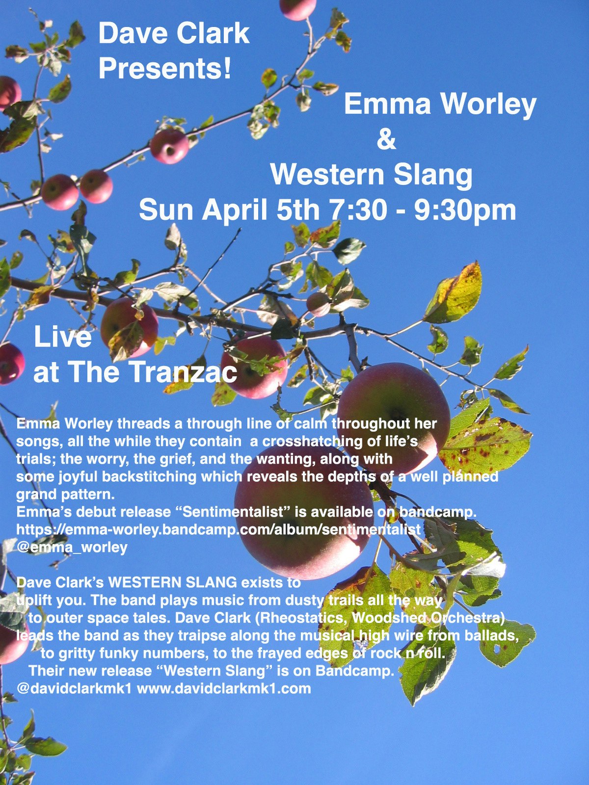 "Dave Clark Presents! the sublime songsmith Emma Worley, whose debut release ""Sentimentalist"" (bandcamp is a work of great beauty. Her songs are deftly crafted to hold her heartfelt narratives. There is a hint of the great master singer/songwriter Mary Margaret O'Hara in her delivery. Also featured on the bill is Dave Clark's WESTERN SLANG. The Western Slang country band exists to uplift you. They play country music from dusty trails to outer space tales with all the of the elegance, mystery and shizz that life can give! Dave Clark (Rheostatics, Charles Spearin, The Woodshed Orchestra) pilots this band from the lead vocalist mic stand as they traipse along the musical high wire from ballads, to gritty funky numbers, to the frayed edges of country rock n roll."
