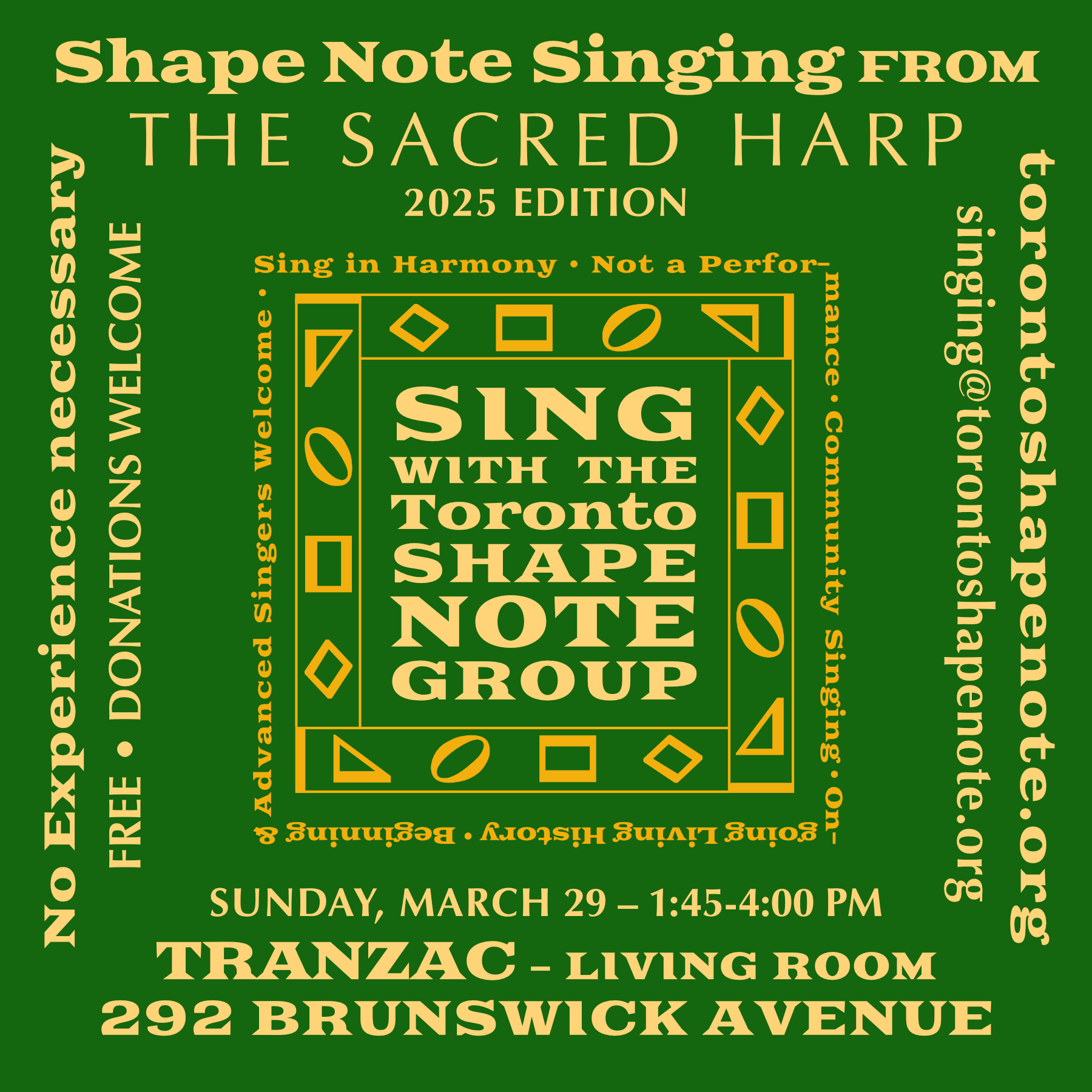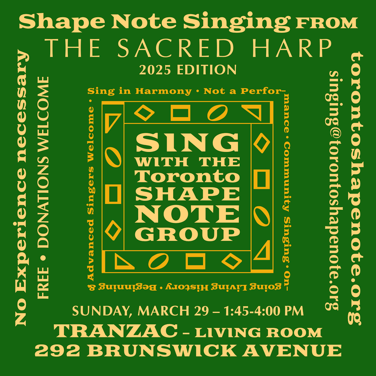 The Toronto Shape Note Group also sings from The Sacred Harp songbook on third Wednesdays at Friends House, 60 Lowther Avenue at 7:30 p.m. We sing from similar books at house singings. In August we hold a 2-day “Convention” with attendees from other provinces, states and countries. Check out torontoshapenote.org or facebook.com/groups/torontoshapenote for more information or email singing@torontoshapenote.org. "