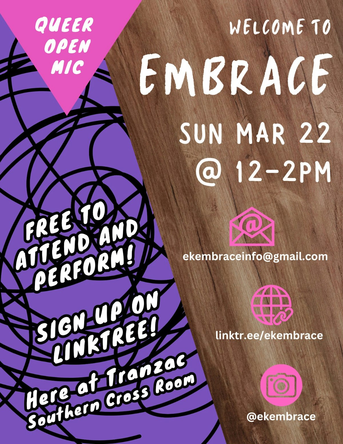 Join EMBRACE – Toronto's longest-running Queer & Trans Open Mic – for a very special pop-up edition at the Tranzac! Divided into three eclectic parts, performances in the past have ranged from live music, drag, spoken word, and clowning, to book readings, comedy, magic, and sea shanty singalongs. All experience levels welcome, signups open in advance (they fill up fast!), and a few in-person slots reserved for spontaneous creative expression. Come be cozy with us, and celebrate the warm arrival of Spring!