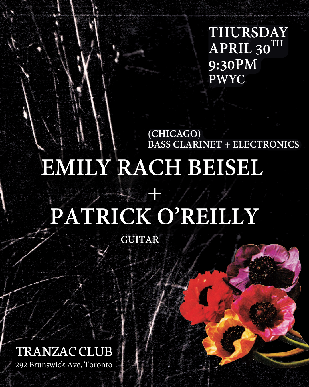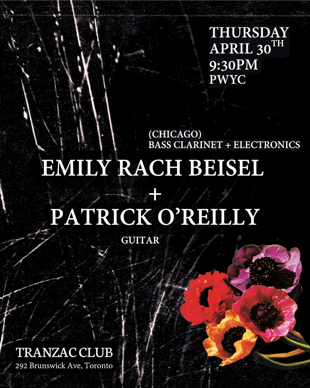 Bass clarinetist Emily Rach Beisel (Chicago) joins Toronto-based Patrick O’Reilly for a night of improvised music. Beisel works with bass clarinet, voice, and analog electronics, shaping dense, shifting textures through extended techniques and live processing. O’Reilly’s work is exploratory, tactile, and emotionally raw, drawing from experimental music and jazz as much as drone, minimalism, and noise, inviting listeners into a world of unexpected beauty.