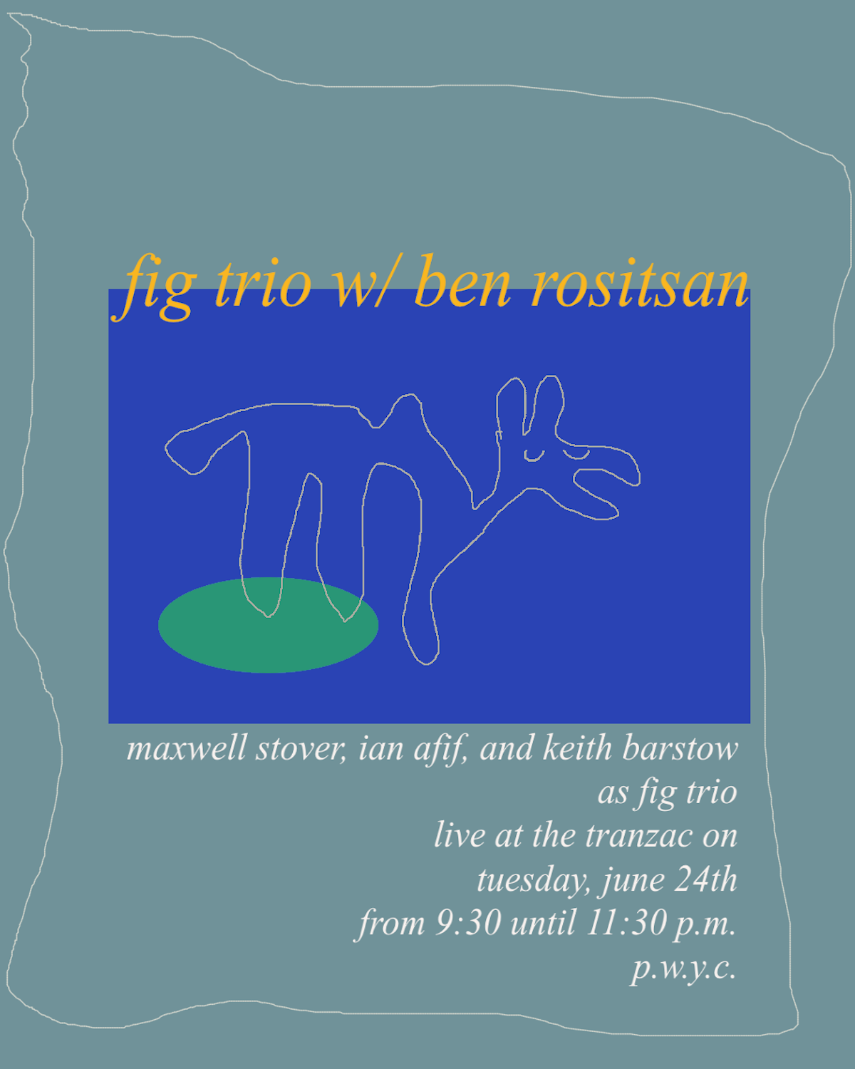 "Fig Trio is comprised of Maxwell Stover's winds, Ian Afif's bass, and Keith Barstow's drums. They improvise music after the free jazz tradition, and also perform standards and originals sometimes. For this occasion, Fig Trio will be performing with Ben Rositsan's winds and are proud to be presenting to the public new musical concepts together.