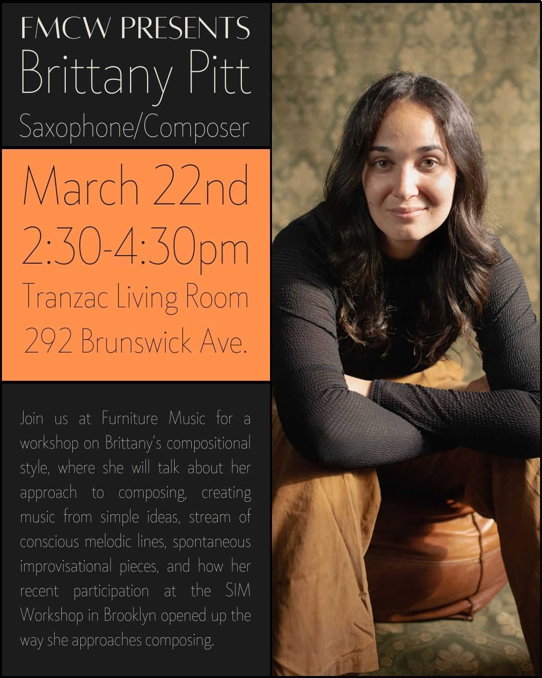 Join us at Furniture Music for a workshop on Brittany’s compositional style, where she will talk about her approach to composing, creating music from simple ideas, stream of conscious melodic lines, spontaneous improvisational pieces, and how her recent participation at the SIM Workshop in Brooklyn opened up the way she approaches composing.