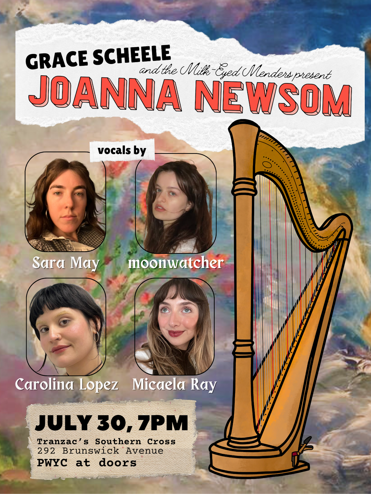 Performed live by harpist Grace Scheele alongside vocalists Sara May, Carolina Lopez, moonwatcher, and Micaela Rae alongside our fearsome backing band the Milk-Eyed Menders. "