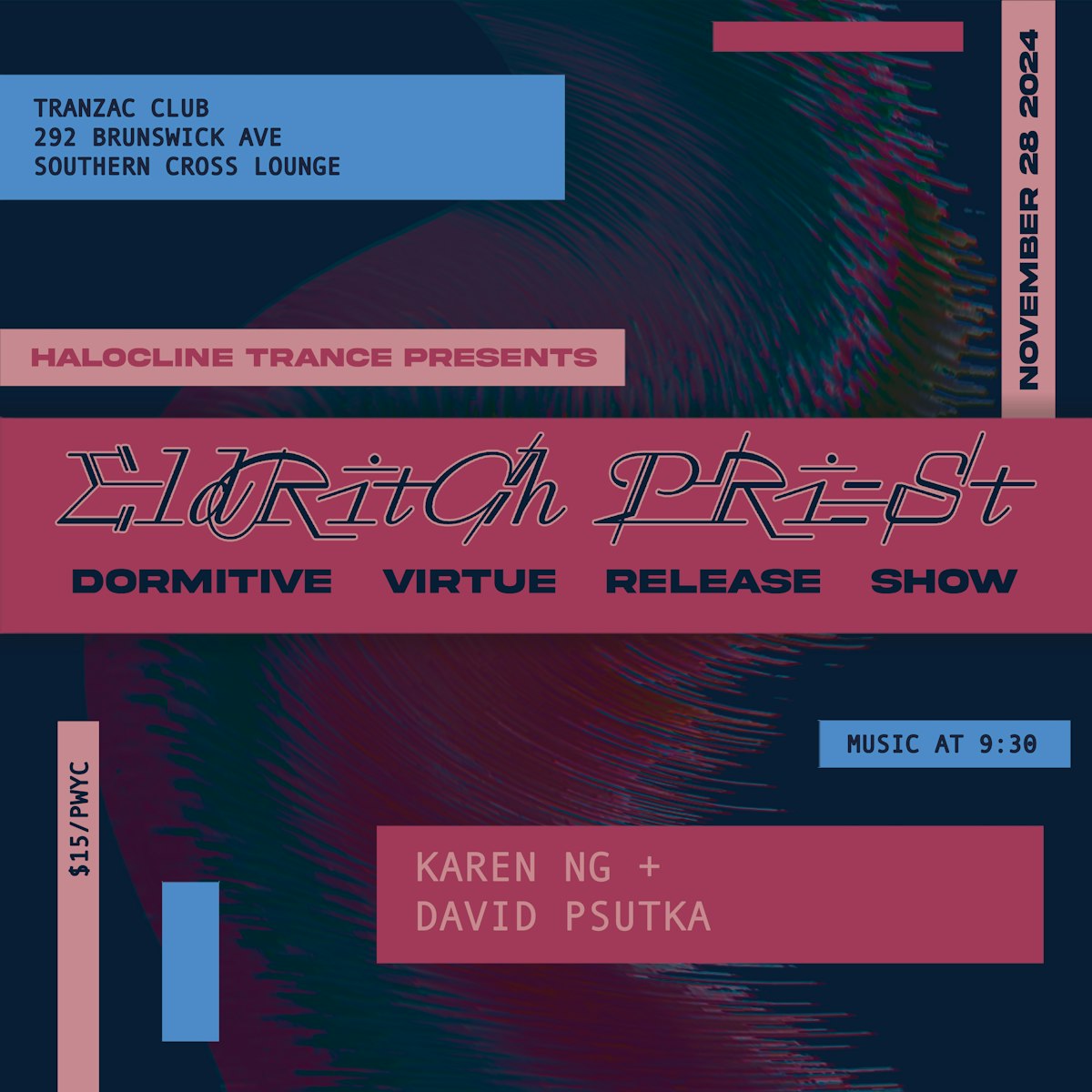 Toronto experimental label Halocline Trance presents a night featuring two of their artists. West coast based guitarist and composer Eldritch Priest celebrates the release of his new album "Dormitive Virtue" and Karen Ng is joined by label founder David Psutka to debut preliminary material from her upcoming album, to be released in 2025.