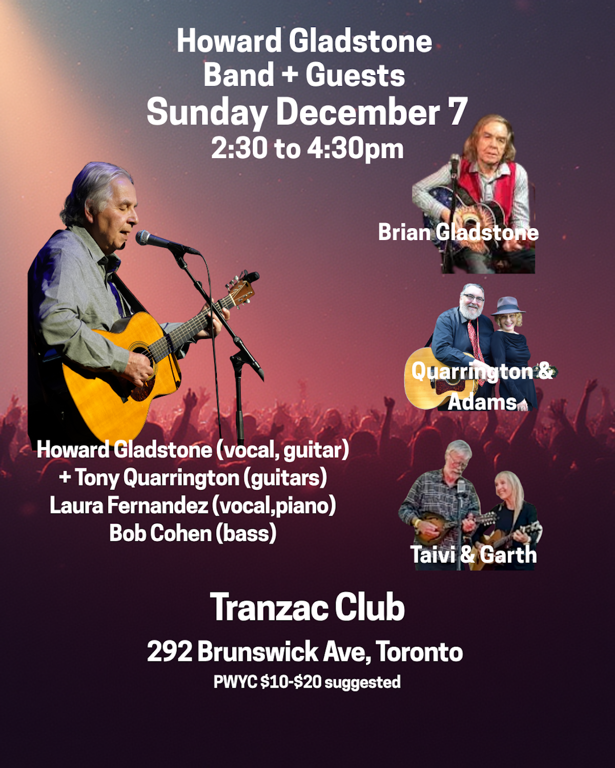 Howard Gladstone is a singer/songwriter with a residency on the “first Sunday of every month” in the Southern Cross Room. He performs original material in the folk, roots, jazz, vein along with stellar accompanists Tony Quarrington (guitar) and Bob Cohen (bass). Most months also feature a Special guest performer to add spice and interest and keep it extra fresh. Howard has released eight albums or original material and continues to add new songs to his repertoris and performances. What to expect? The Toronto Star stated: “If you heard this music in a crowded room, you’d swear it was a lost gem from another time.”