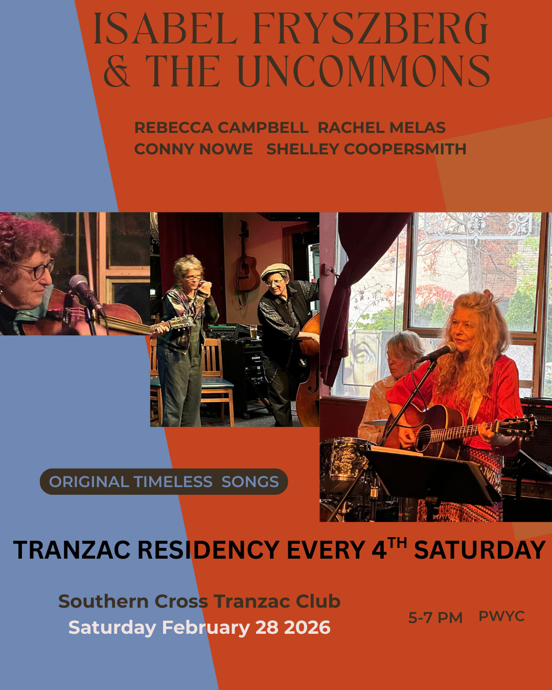 Isabel Fryszberg is a hybrid artist (songwriter, painter, therapist) and a storyteller at heart. Her songs explore themes of connection, urban life, family, love and loss. Her Uncommon band highlights some of Toronto’s finest, veteran musicians. Over the last year her all women, Uncommon band features Rebecca Campbell (Jane Siberry) Rachel Melas (Swamperella ) Conny Nowe (Swamperella) and Shelley Coopersmith (Cameron Family Singers). This is her second year performing every 4th Saturday of the month from 5-7PM as part of the Tranzac residency program. Isabel’s melodies, include evocative three part harmonies, weave a tapestry of genre-blending folk, with jazz, blues , country and bluegrass influences. Her songs are quirky and reflective, from toe tapping, with some giggles, to honest and deeply human. These include songs of protest and some deeply personal ones. Always fun with some surprises and at times with some mighty fine special guests! "
