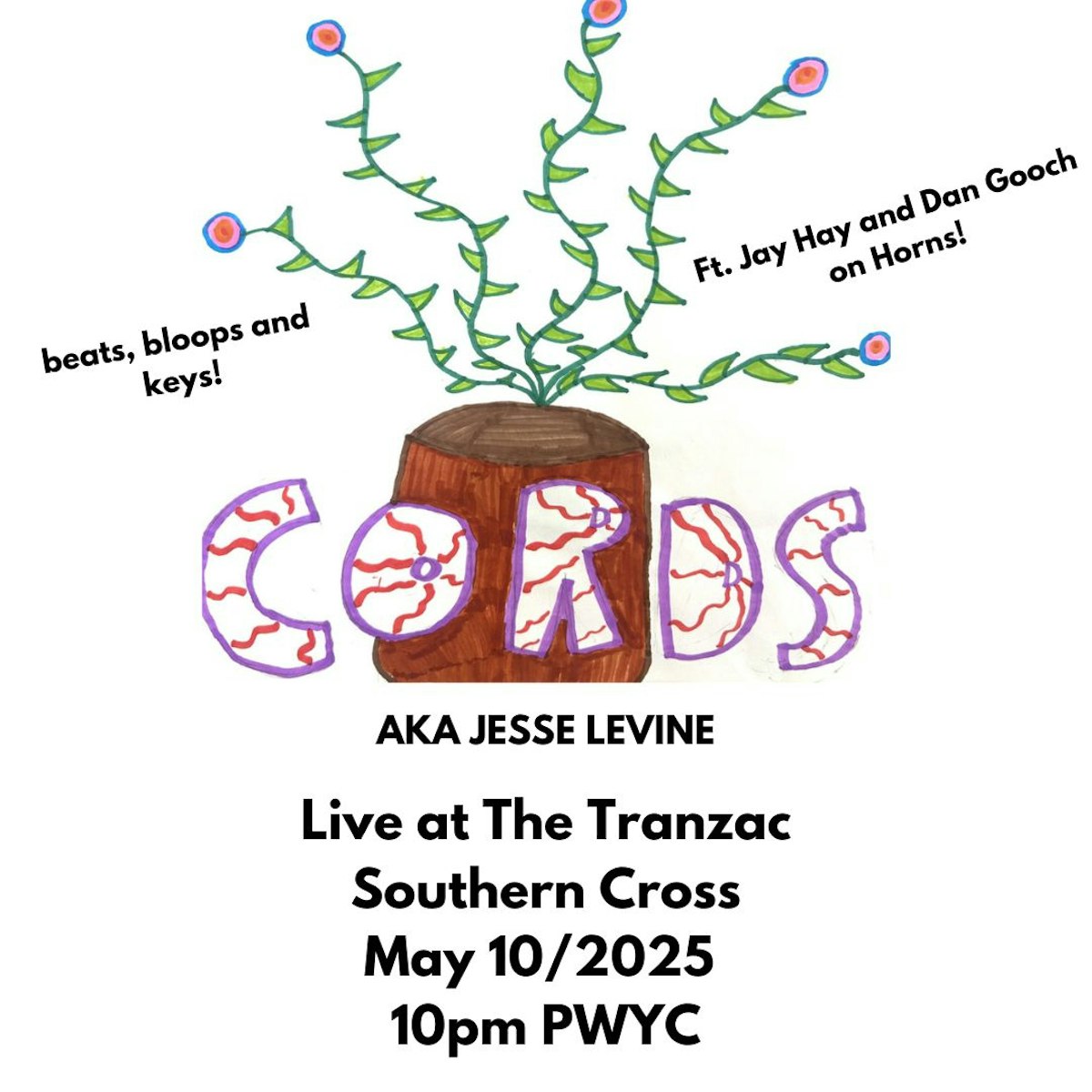 Join local keyboard player, funk obsessed and all around good person Jesse Levine (CORDS) for a night of loops, bloops, beats, jazz, soul and hip hop. Featuring thee mighty Jay Hay on saxes and flute and Dan Gooch on trumpet, the artist known as CORDS will wrap warm sounds around your brain so that you can feel better about life. Come listen to tracks off his new album “Face the Sun” as well as other assorted yummy snacks.