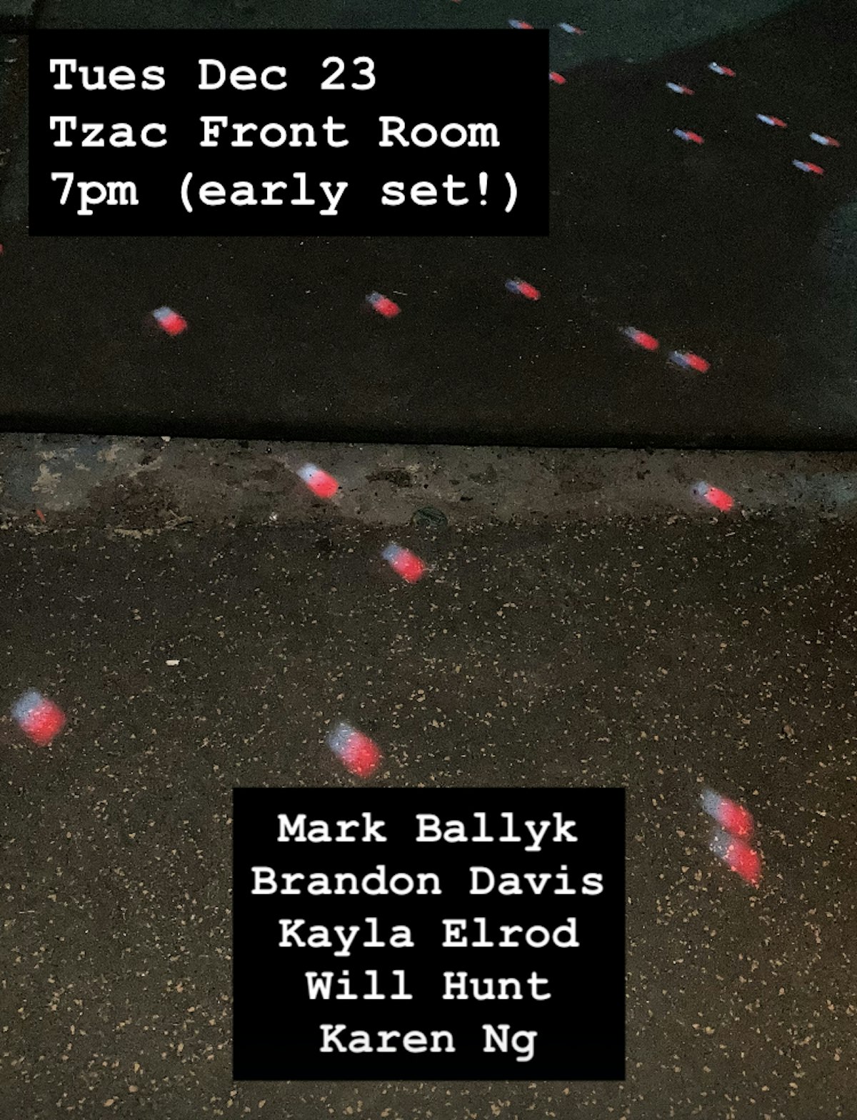 For this month's Karen Ng presents we welcome Mark Ballyk and Kayla Elrod visiting from Berlin! 2 sets of improvised music with guests Brandon Davis, Will Hunt and myself. Stick around after for the Ryan Driver Sextet!