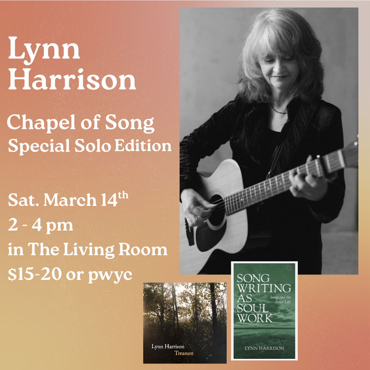 Singer-songwriter Lynn Harrison presents a special solo edition of her popular "Chapel of Song" series of intimate concerts in the Tranzac Living Room. Come for community connection, reflections on creativity and spirituality, and timeless songs about life and love.