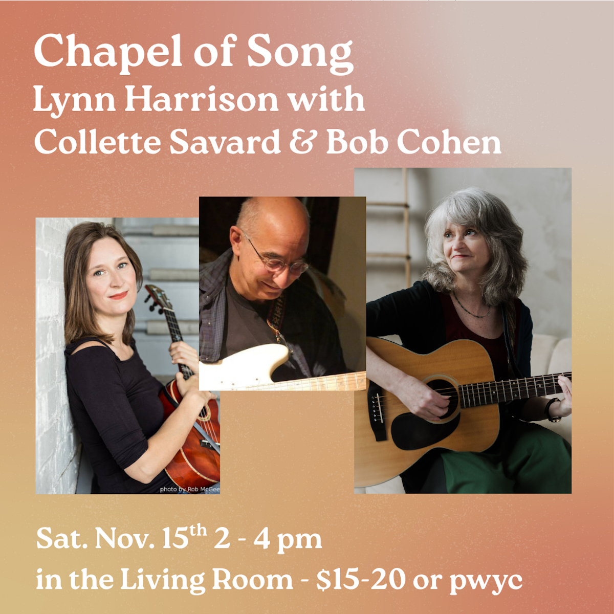 Chapel of Song: Lynn Harrison in concert with Bob Cohen and special guest Collette Savard. Music, conversation and community. This month's theme: self-love! $15-20 suggested or pay what you can.