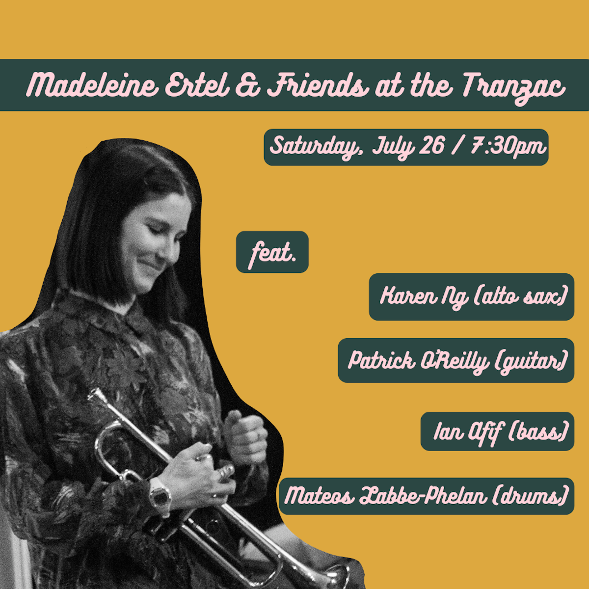 After a year in Berlin, Madeleine Ertel is back in Toronto and thrilled to be joined by Karen Ng (alto sax), Patrick O'Reilly (guitar), Ian Afif (bass), and Mateos Labbe-Phelan (drums) at the Tranzac. This group of friends will play a mixture of improvisations, originals, and popular songs - come and hang out!