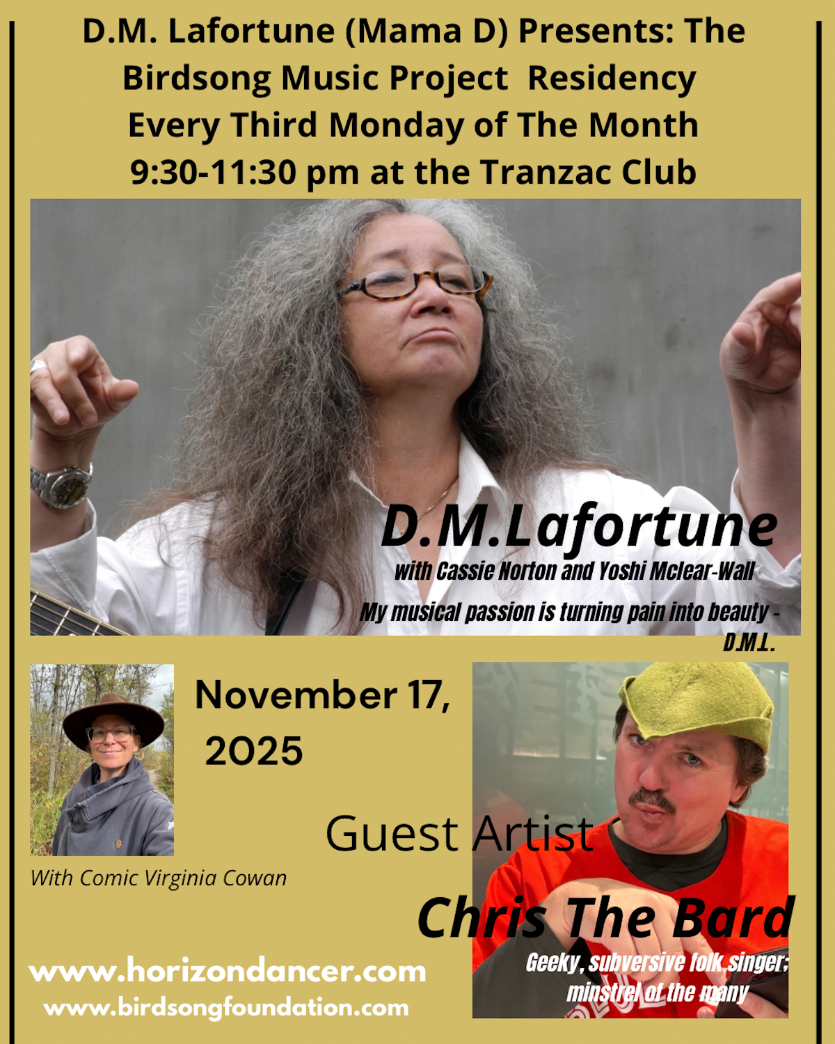 Birdsong New Music Foundation artist, Diem Lafortune hosts A Birdsong Music Project Residency. in support of singer-songwriters with mental health vulnerabilities. She'll have a guest singer-songwriter and poet/storyteller each evening. There'll be a lot of singing for everyone - music heals all: spirit, soul, body mind.