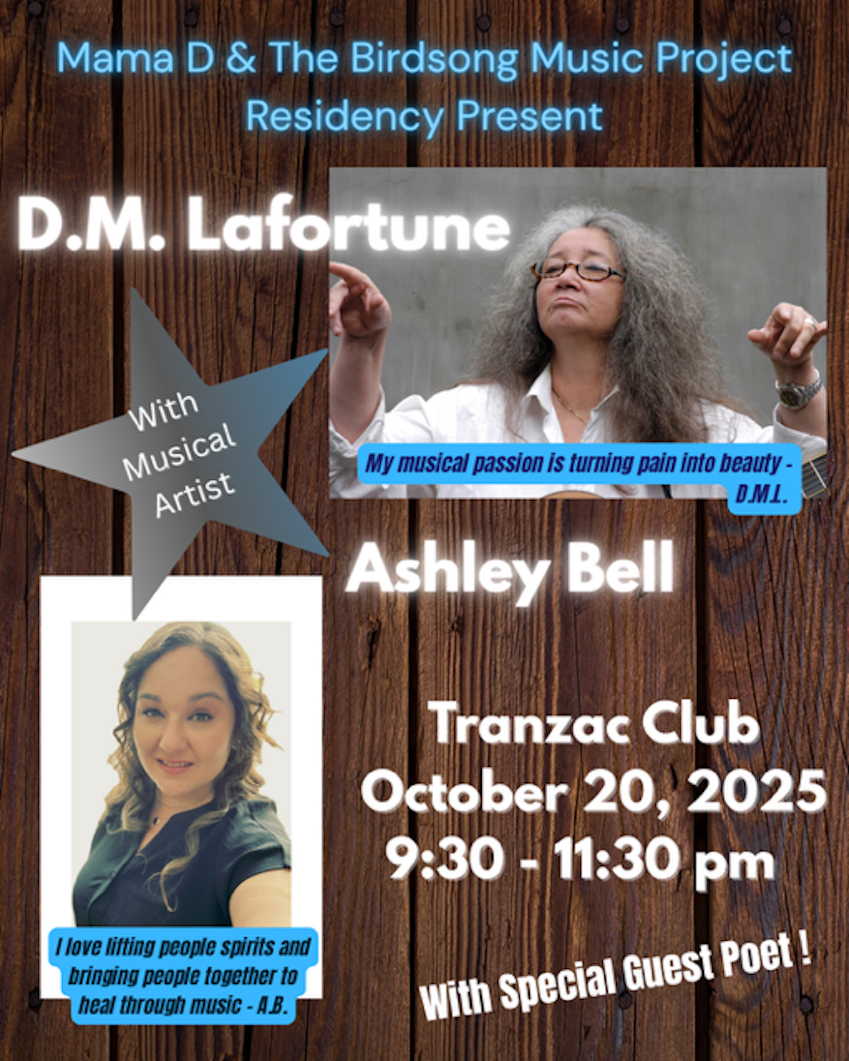 Birdsong New Music Foundation artist, Diem Lafortune hosts A Birdsong Music Project Residency. in support of singer-songwriters with mental health vulnerabilities. She'll have a guest singer-songwriter and poet/storyteller each evening. There'll be a lot of singing for everyone - music heals all: spirit, soul, body mind.