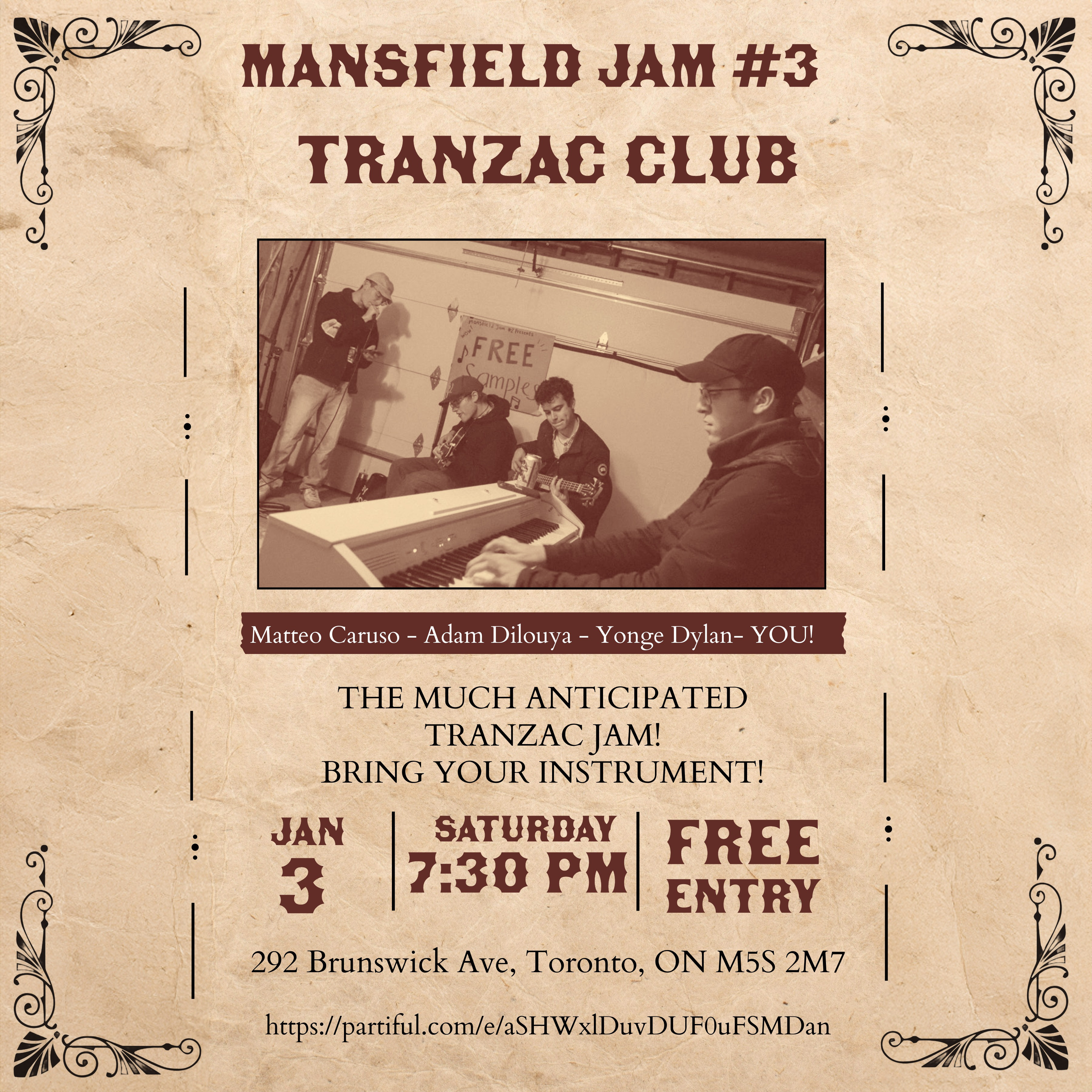 The Mansfield Jam is a performance and jam series led by Adam Dilouya, Matteo Caruso and Justin Mihaly. Each instalment of the Mansfield Jam features covers of singalong classics and beloved jazz standards. Their mission with this series of concerts is to loosen the boundary between performer and audience and encourage people to embrace their own inner musician! Bring your instrument, your voice, and your moves!