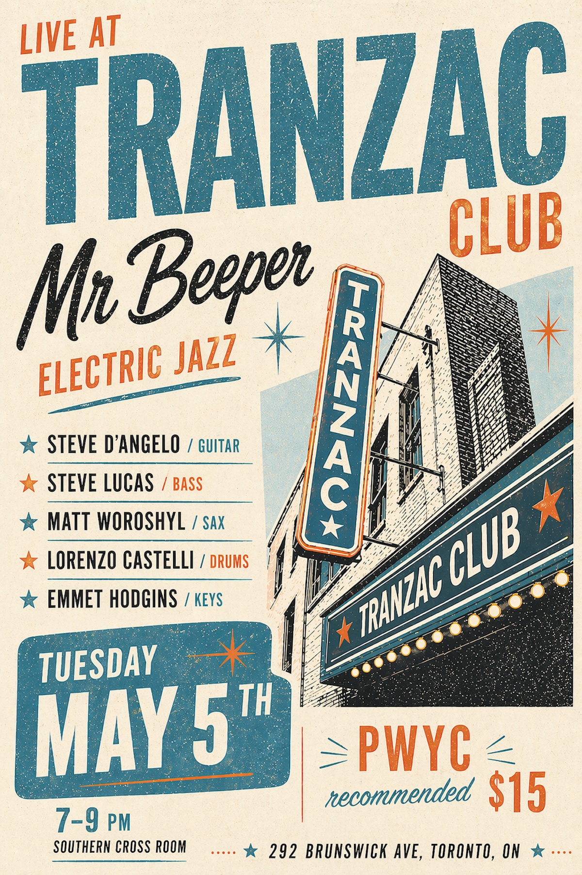 Join Mr Beeper for an evening of Jazz Fusion. Inspired by the fusion music of the 60,s,70,s and 80,s the quintet delivers a high energy show playing both covers and original material.