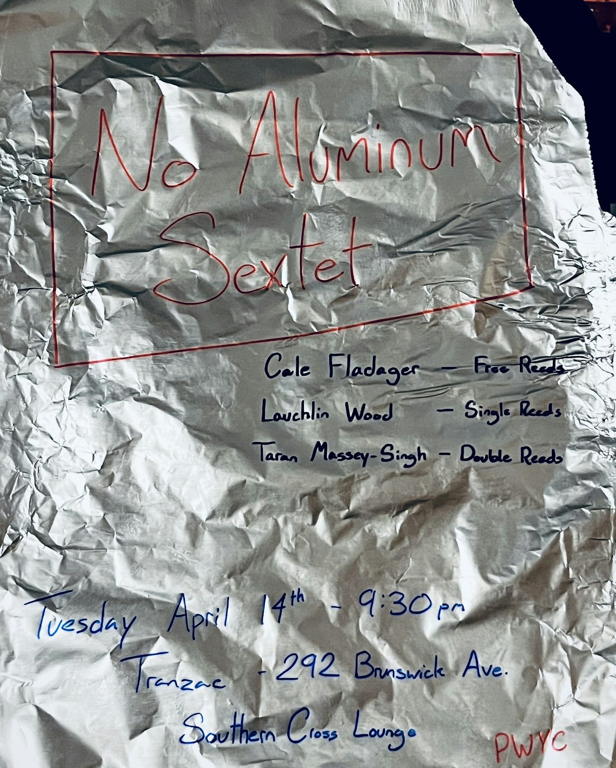 Join the No Aluminum Sextet for an evening of free improvised and experimental music, pushing the boundaries of single, double, and free reed instruments. Come and experience this one of a kind ensemble and discover the endless possibilities of reed instruments.