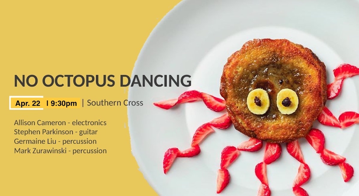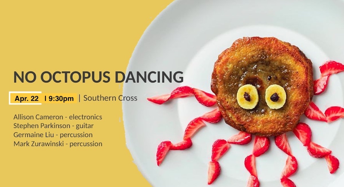 "Spontaneous, witty, percussive, organic, electric, No Octopus Dancing will play three sets of spontaneous electroacoustic spatter wrangled by organic percussive clatter. Come join us for three sets of freely improvised music inspired by our collective and freely sourced brain waves. Tuesday, April 22 @ 9:30pm, Southern Cross.
