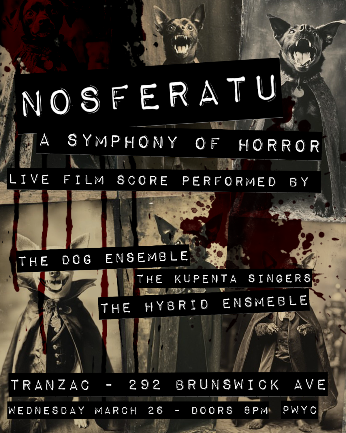 U of T jazz presents three ensembles tag-teaming a live score to Nosferatu - A Symphony of Horror! Students from all corners of the Faculty of Music join forces to create a stunning piece of music. There will be a choir (The Kupenta Singers), a chamber group (The Hybrid Ensemble) and an improvising group (the DOG ensemble) to help weave this classic tale of intrigue and horror!