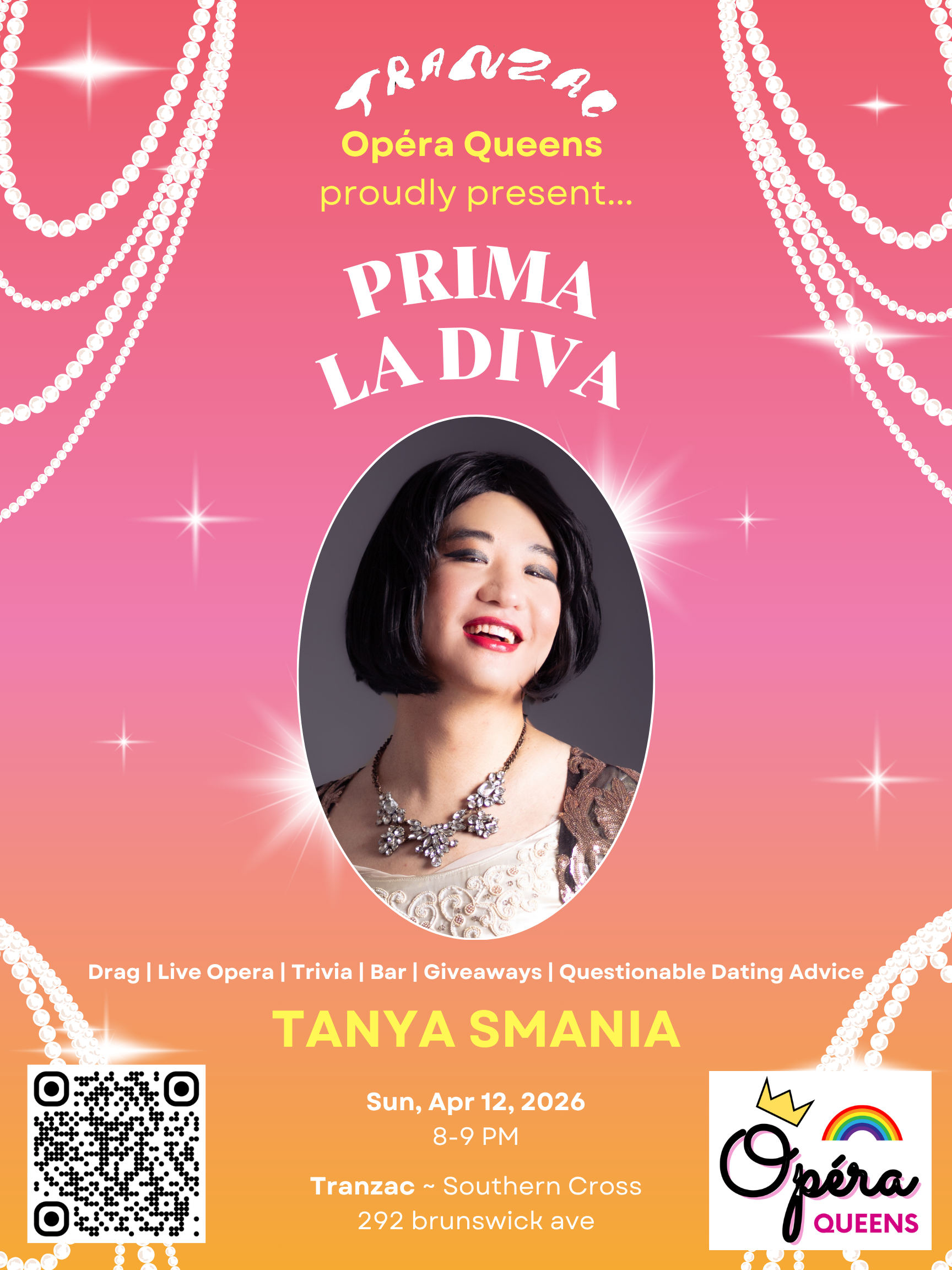 "Join Toronto’s own operatic drag diva Tanya Smania for the launch of Tranzac’s very first opera residency OPERA QUEENS on Sunday, April 12 from 8-9 PM - “Prima la Diva”! Doors open at 7:30 PM, celebrate with a drink and snack afterwards until 9:30 PM, and get your exclusive Opera Queens merch!
