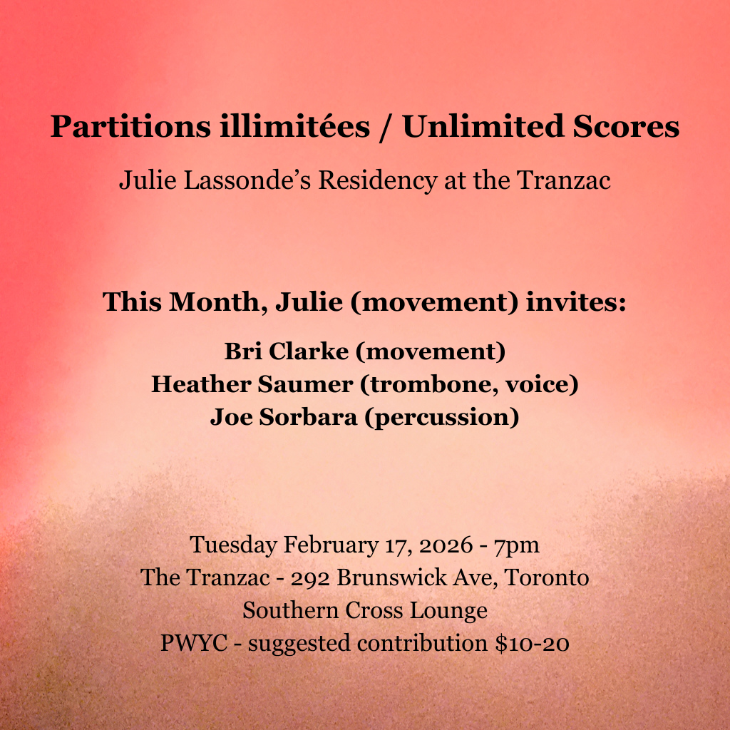 "Experience Julie Lassonde's residency involving movement and sound improvisation. This month, they invite Bri Clarke (movement), Heather Saumer (trombone, voice) and Joe Sorbara (percussion). Together, they will perform scores composed by Julie specifically for this residency.