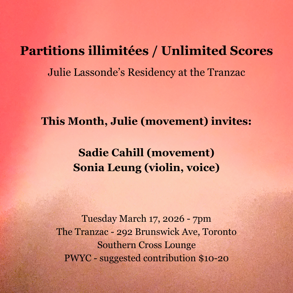 "Experience Julie Lassonde's residency involving movement and sound improvisation. This month, they invite Sadie Cahill (movement) and Sonia Leung (violin, voice). Together, they will perform scores composed by Julie specifically for this residency.