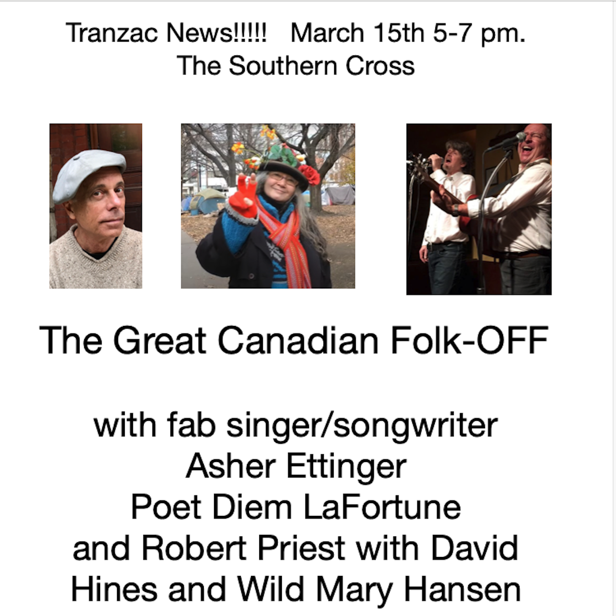 A very special folk off with songwriter, Asher Ettinger and in her role as a poet, Diem Lafortune. All this plus Robert Priest backed by David Hines on a set of original songs and a poem or two.