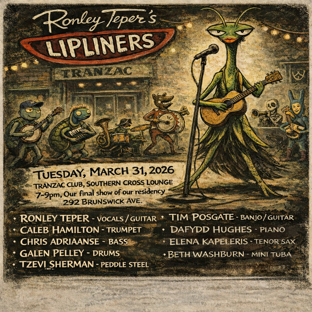Ronley Teper & The Lipliners final Tuesday residency at The Tranzac. Expect big band, folkrchestral flunk punk. New songs, old songs, songs on the fly. Bye Bye for now. We Love The Tranzac!