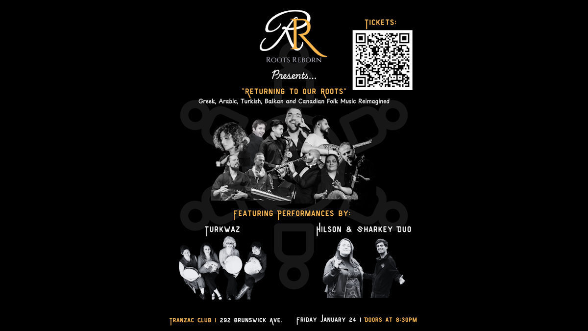 Roots Reborn presents “Returning to Our Roots.” This concert will showcase traditional Greek, Arabic, Turkish, Balkan and Canadian Folk songs, reimagined; with performances by Roots Reborn, Turkwaz and the Hilson & Sharkey Canadian Folk duo. This is a one-of-a-kind international music showcase that will have the crowd feeling great.