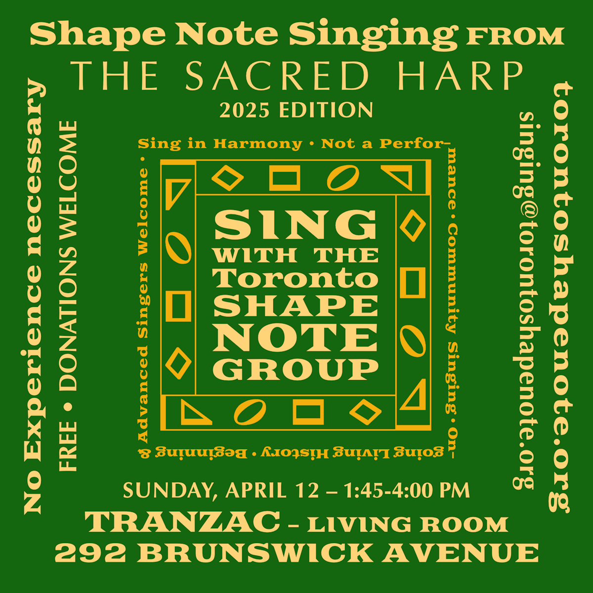 The Toronto Shape Note Group also sings from The Sacred Harp songbook on third Wednesdays at Friends House, 60 Lowther Avenue at 7:30 p.m. We also have house singings singing from similar books. On May 9th, we are having a Singing School at Detweiler Meeting House in Ayr, Ontario. In August we hold a 2-day “Convention” with attendees from other provinces, states and countries. Check out torontoshapenote.org or facebook.com/groups/torontoshapenote for more information or email singing@torontoshapenote.org. "
